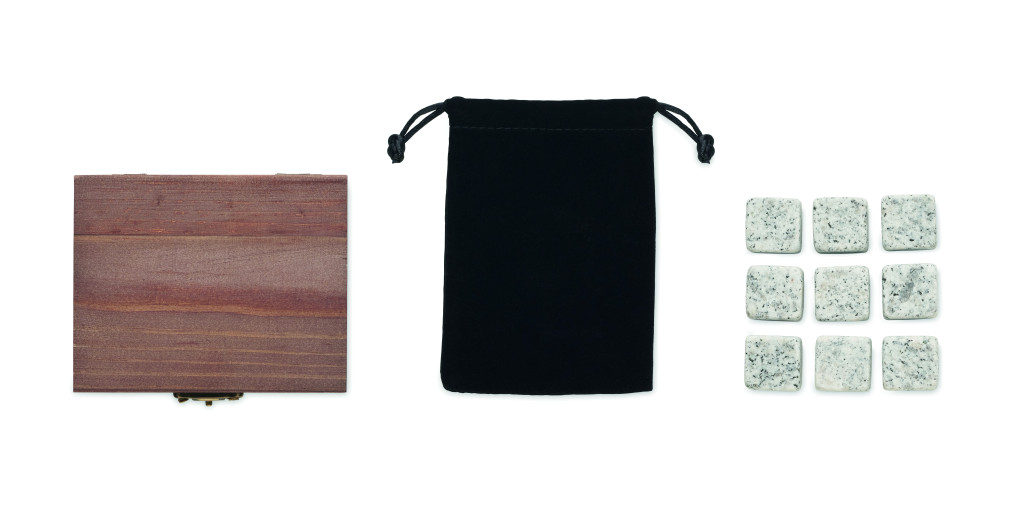 Többször használható kő jégkockák, fenyőfa dobozban. 9 db kő kockát, valamint bársony tárolótasakot tartalmaz.