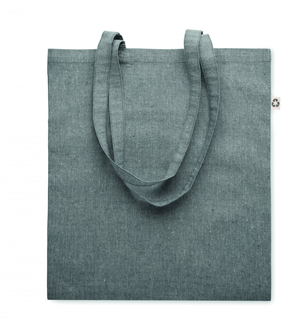 Újrahasznosított pamut bevásárlótáska (80% újrahasznosított pamut, 20% pamut) hosszú fülekkel. 140 g vastag anyag.