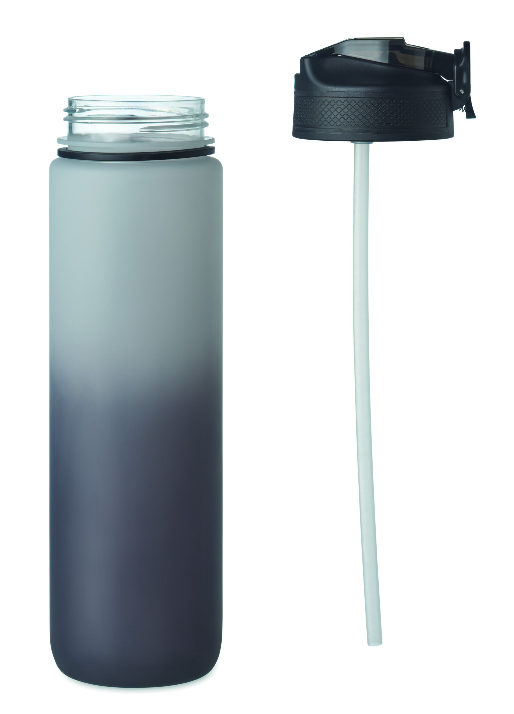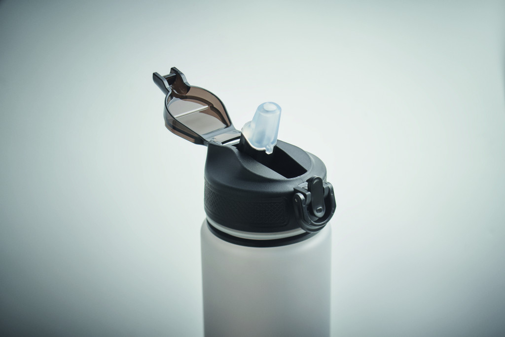 Sportkulacs RPET-ből, beépített szívószállal, puha szilikon ivórésszel, motivációs időjelzéssel, egy kézzel nyitható, felpattintható fedéllel, biztonsági zárral és hordszíjjal. Szivárgásmentes. Űrtartalom: 1 liter.