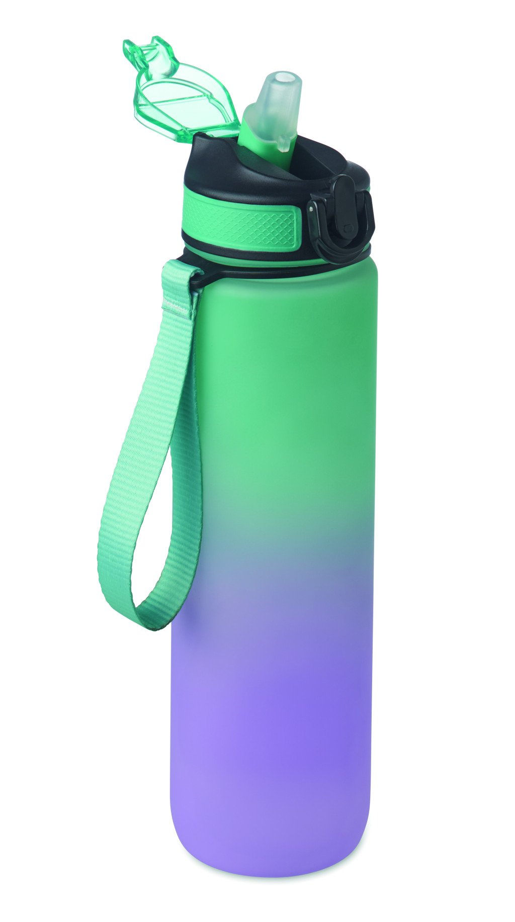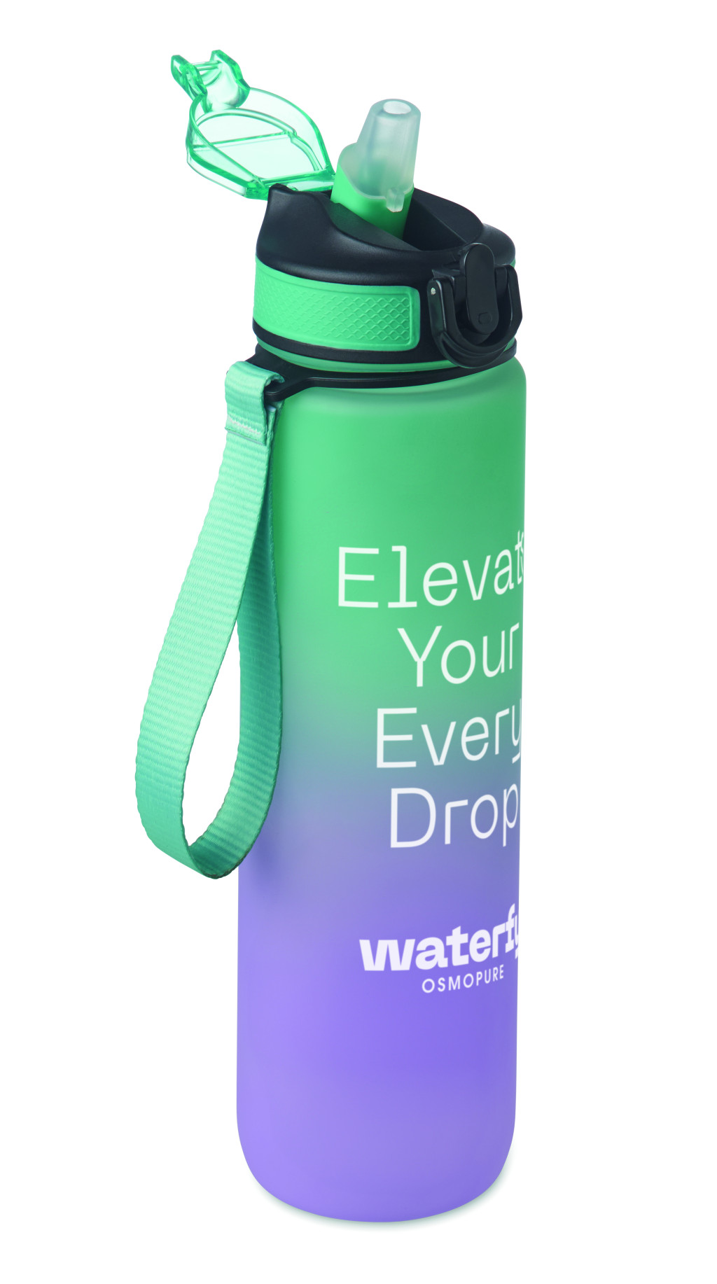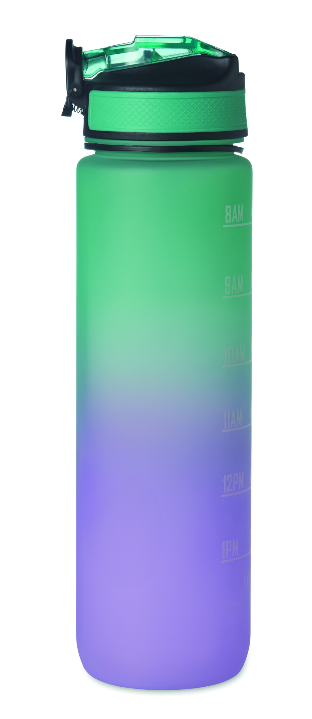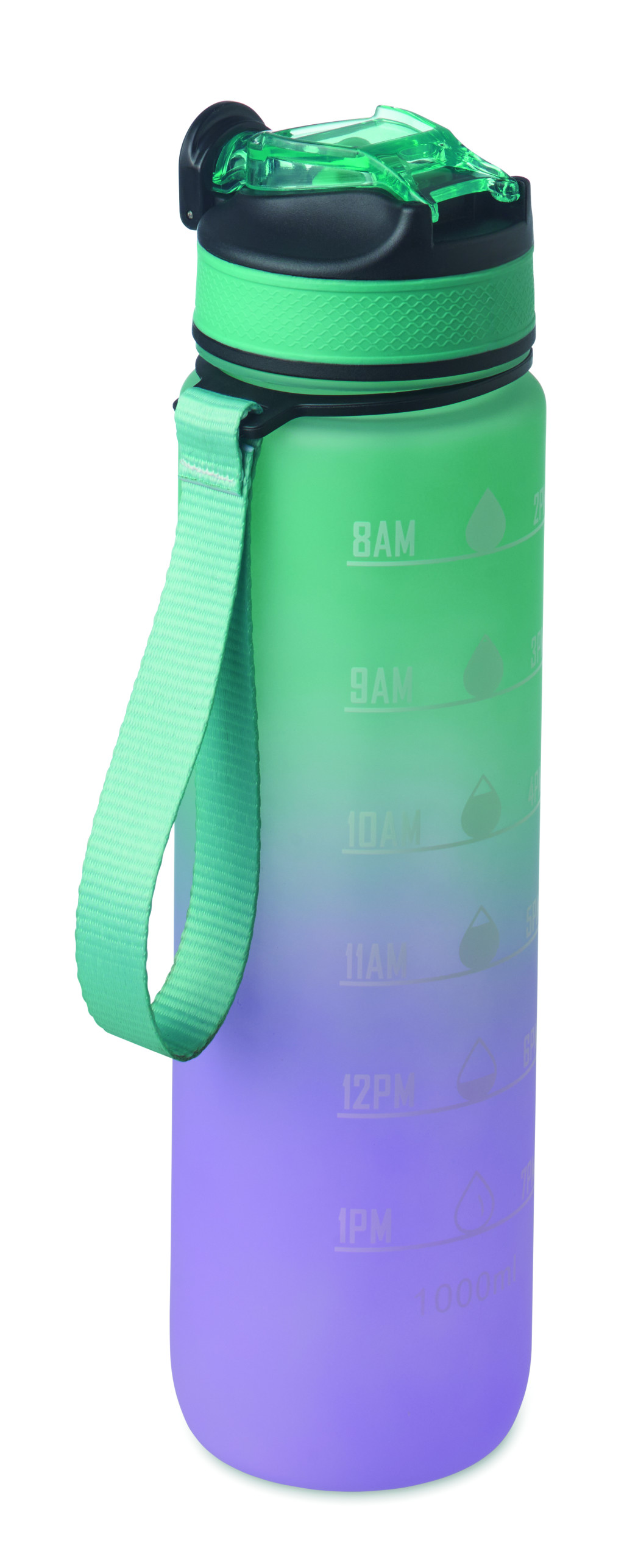 Sportkulacs RPET-ből, beépített szívószállal, puha szilikon ivórésszel, motivációs időjelzéssel, egy kézzel nyitható, felpattintható fedéllel, biztonsági zárral és hordszíjjal. Szivárgásmentes. Űrtartalom: 1 liter.