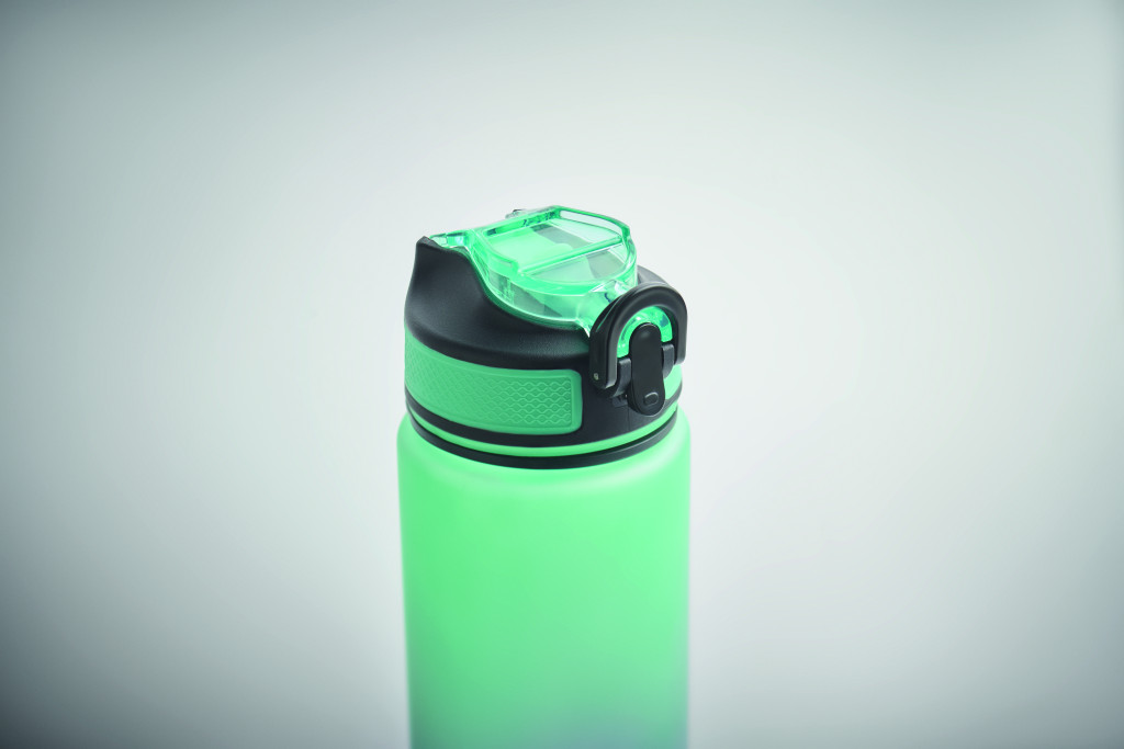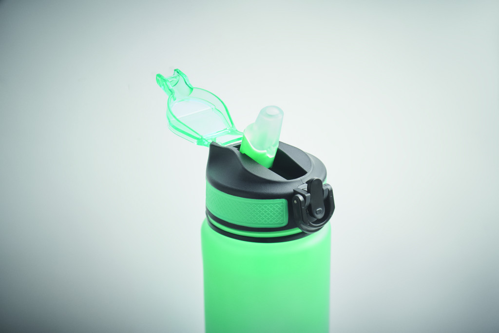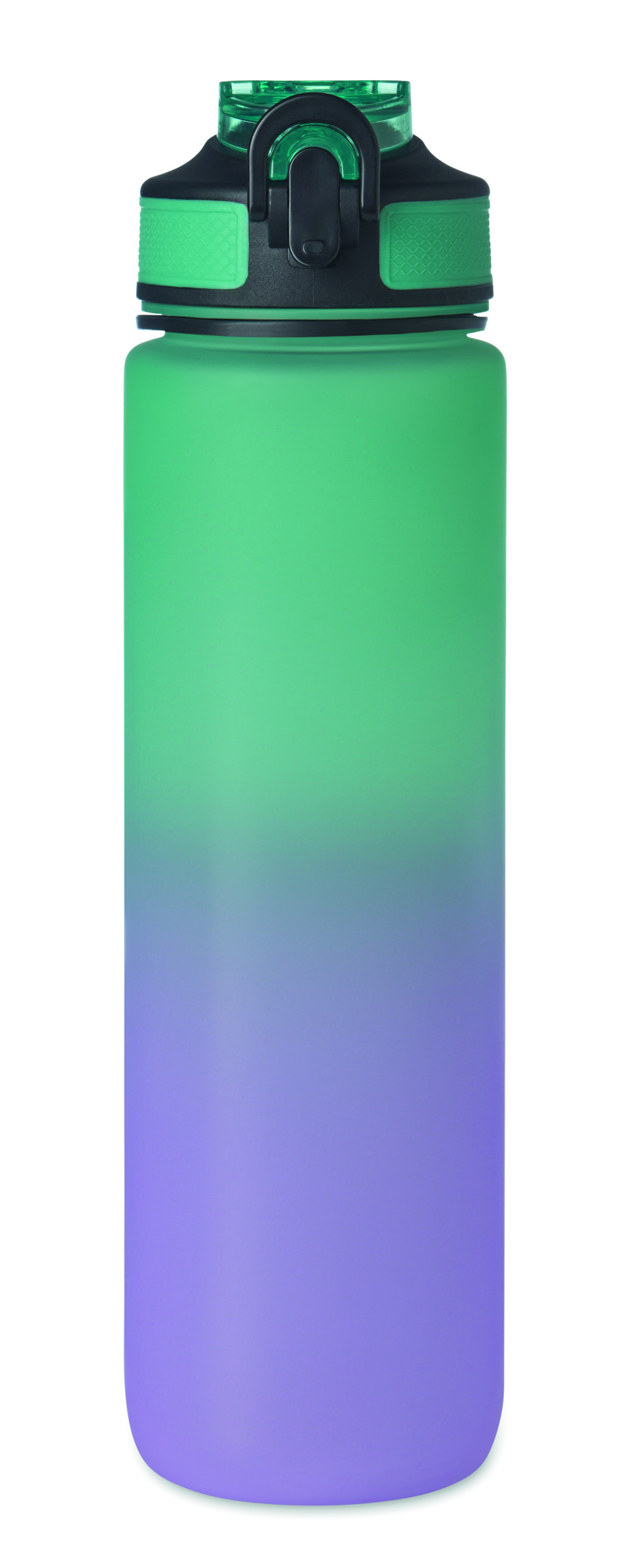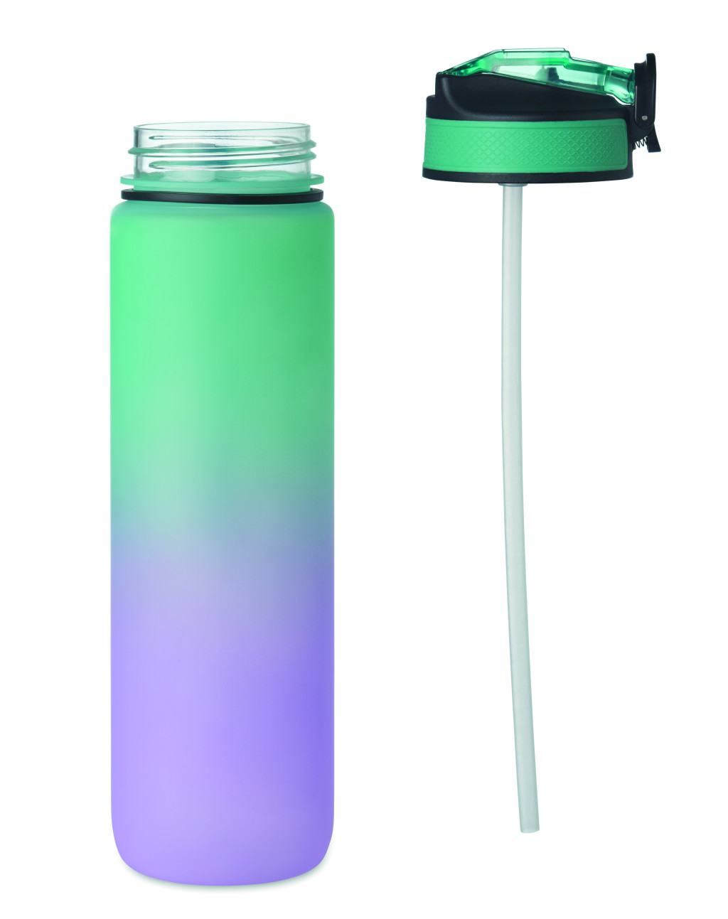 Sportkulacs RPET-ből, beépített szívószállal, puha szilikon ivórésszel, motivációs időjelzéssel, egy kézzel nyitható, felpattintható fedéllel, biztonsági zárral és hordszíjjal. Szivárgásmentes. Űrtartalom: 1 liter.