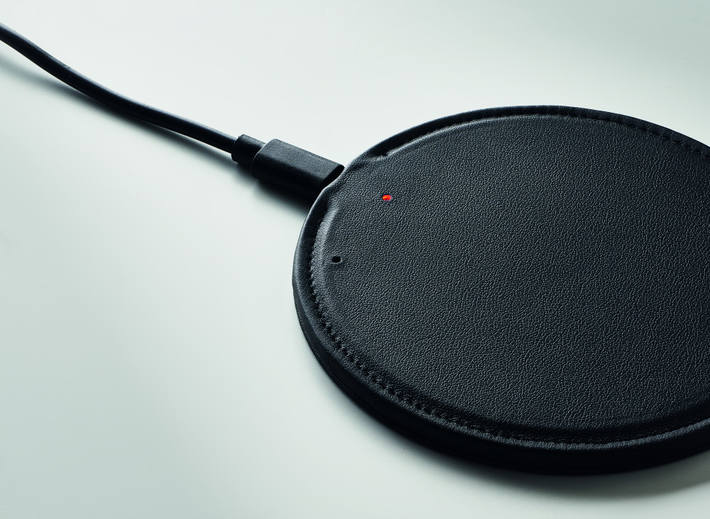 Újrahasznosított PU vezeték nélküli töltő. 58%-ban újrahasznosított anyag (40% újrahasznosított poliészter és 18% újrahasznosított PU). Teljesítmény: DC 9V/1 ,67A (15W) a gyorstöltéshez. Qi készülékekhez (újabb Android, iPhone® 8, X, stb.).