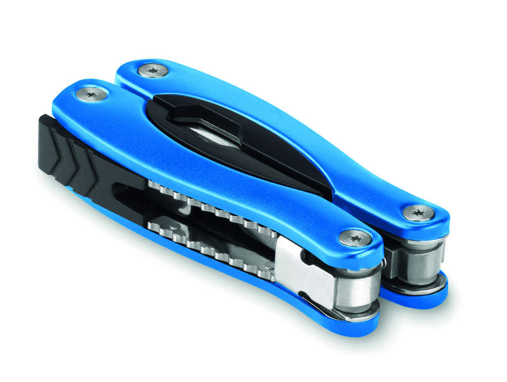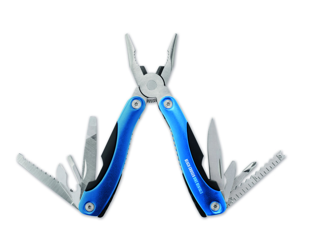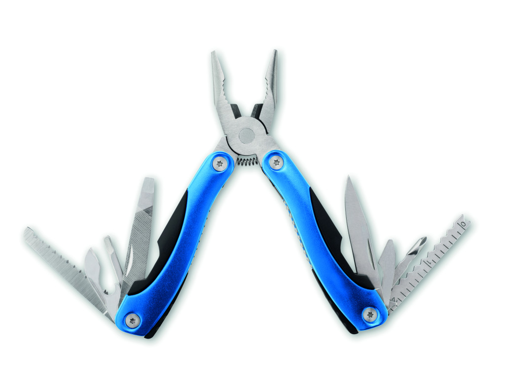 Összecsukható rozsdamentes acél multifunkciós kés. 9 funkció. ABS markolat és 600D poliészter tok.