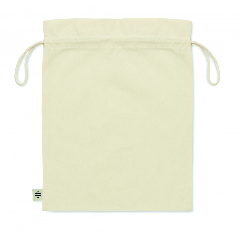 Közepes méretű húzózsinóros ajándéktasak biopamutból. Méret kb. 25x32 cm. 105 g vastag anyag.