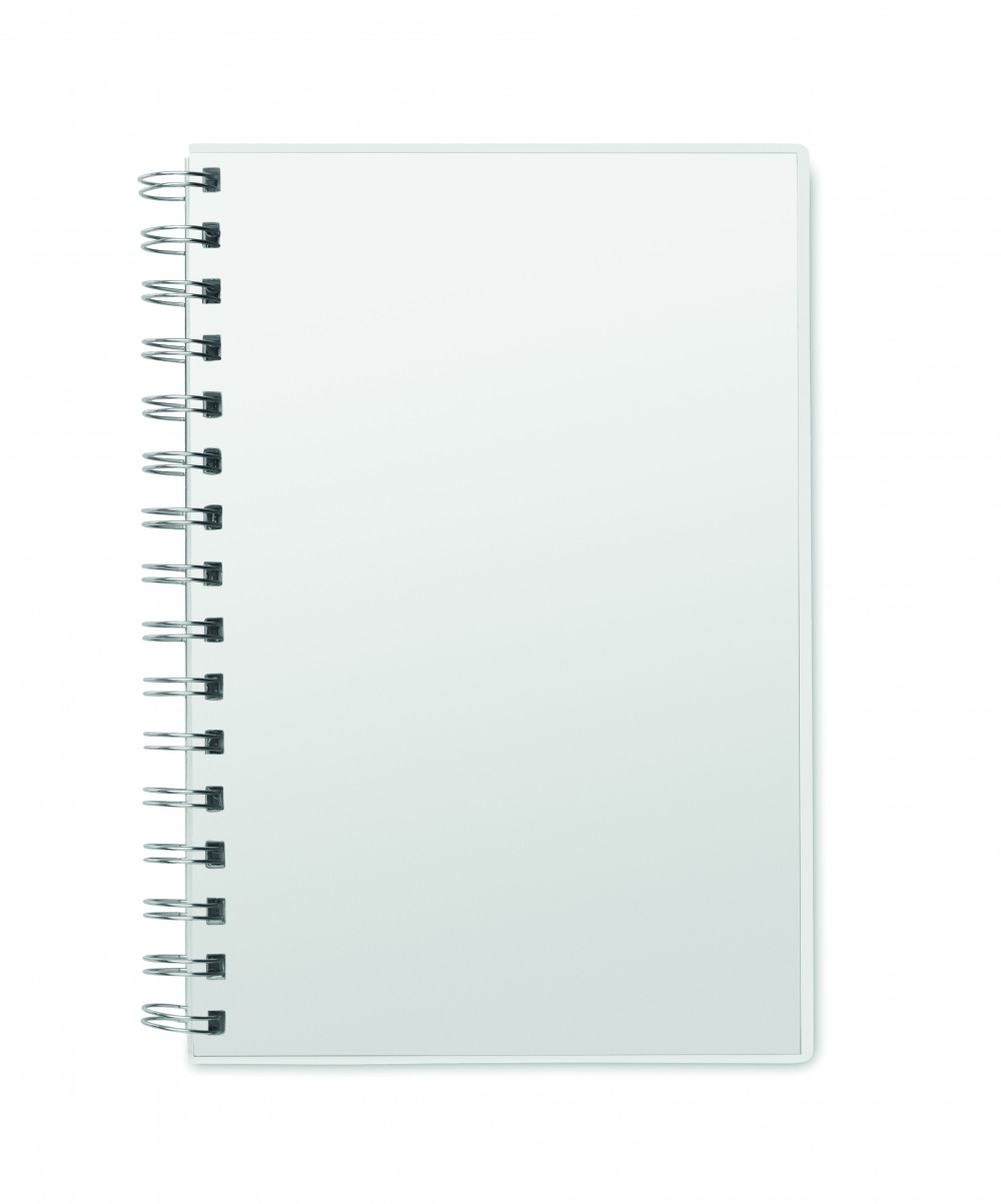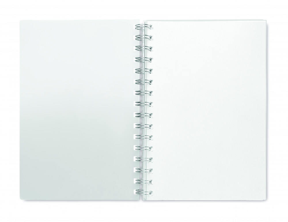 A5 jegyzetfüzet RPET borítóval. Ikerspirálozott. 160 vonalas oldal (80 lap) újrahasznosított papírból.
