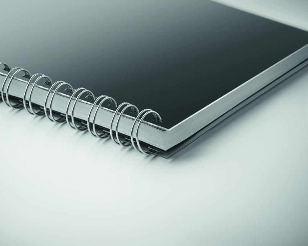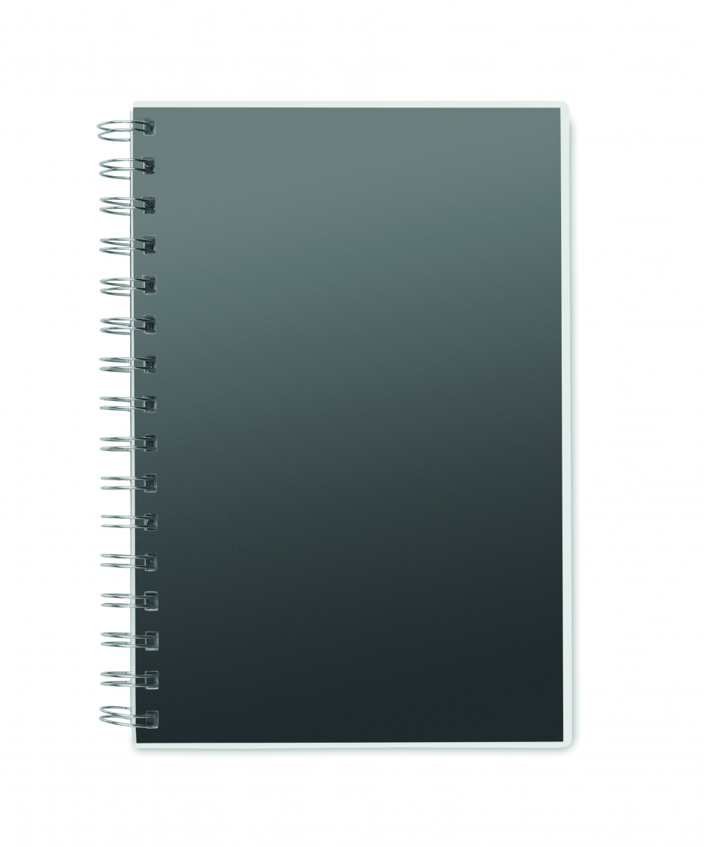 A5 jegyzetfüzet RPET borítóval. Ikerspirálozott. 160 vonalas oldal (80 lap) újrahasznosított papírból.