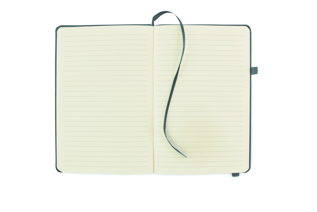 A5 jegyzetfüzet, 70%-ban fogyasztás előtti újrahasznosított bőrből és 30%-ban latexből készült PU borítóval. Cérnafűzött. 192 vonalas oldal újrahasznosított papírból (96 lap). Színben illeszkedő elasztikus zárópánt, tolltartó hurok és könyvjelző szalag.