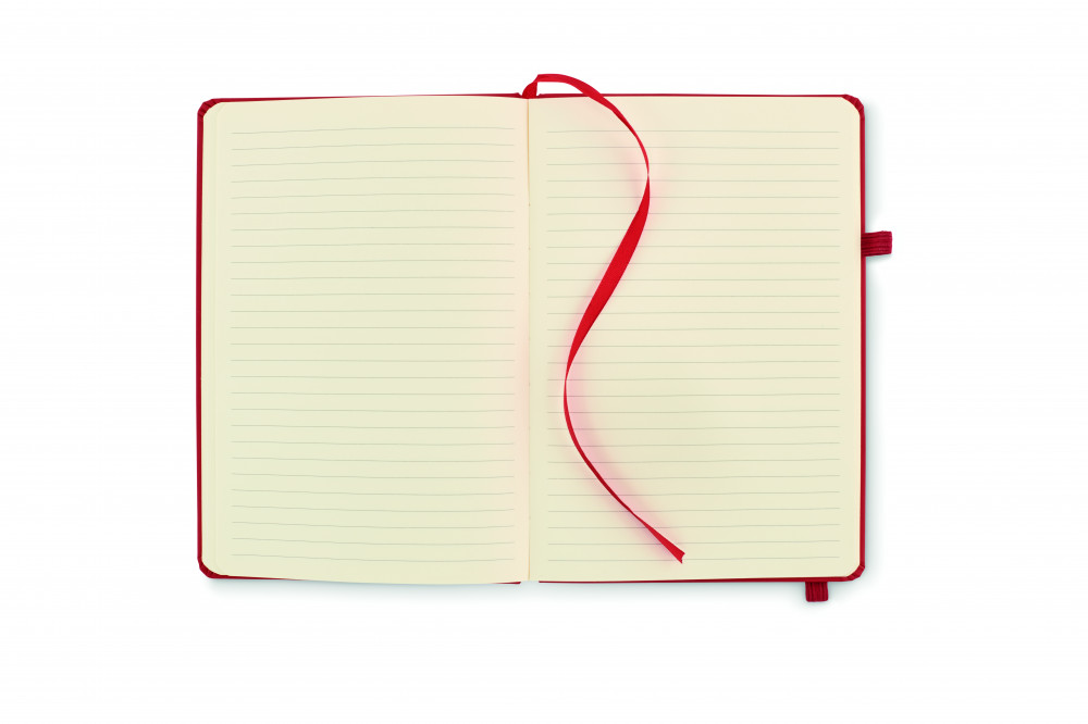 A5 jegyzetfüzet, 70%-ban fogyasztás előtti újrahasznosított bőrből és 30%-ban latexből készült PU borítóval. Cérnafűzött. 192 vonalas oldal újrahasznosított papírból (96 lap). Színben illeszkedő elasztikus zárópánt, tolltartó hurok és könyvjelző szalag.