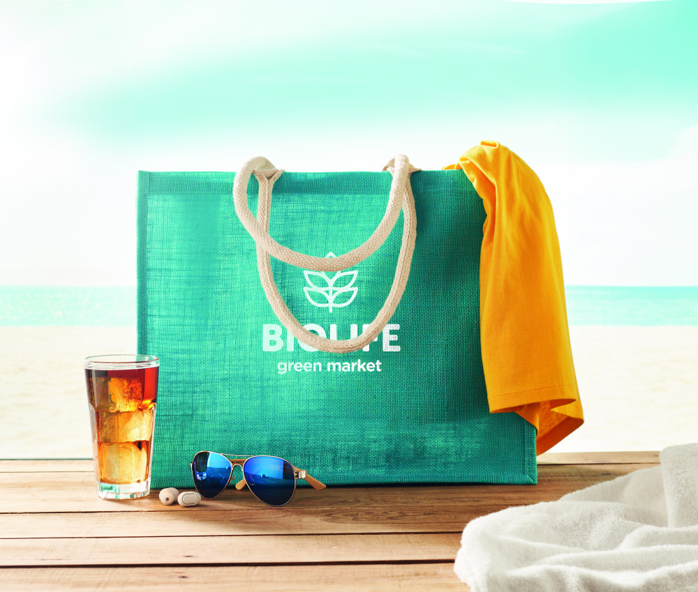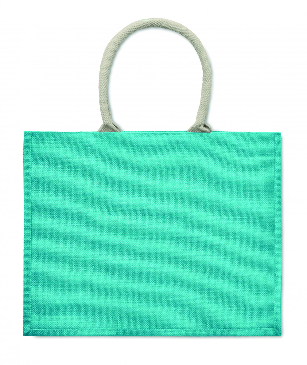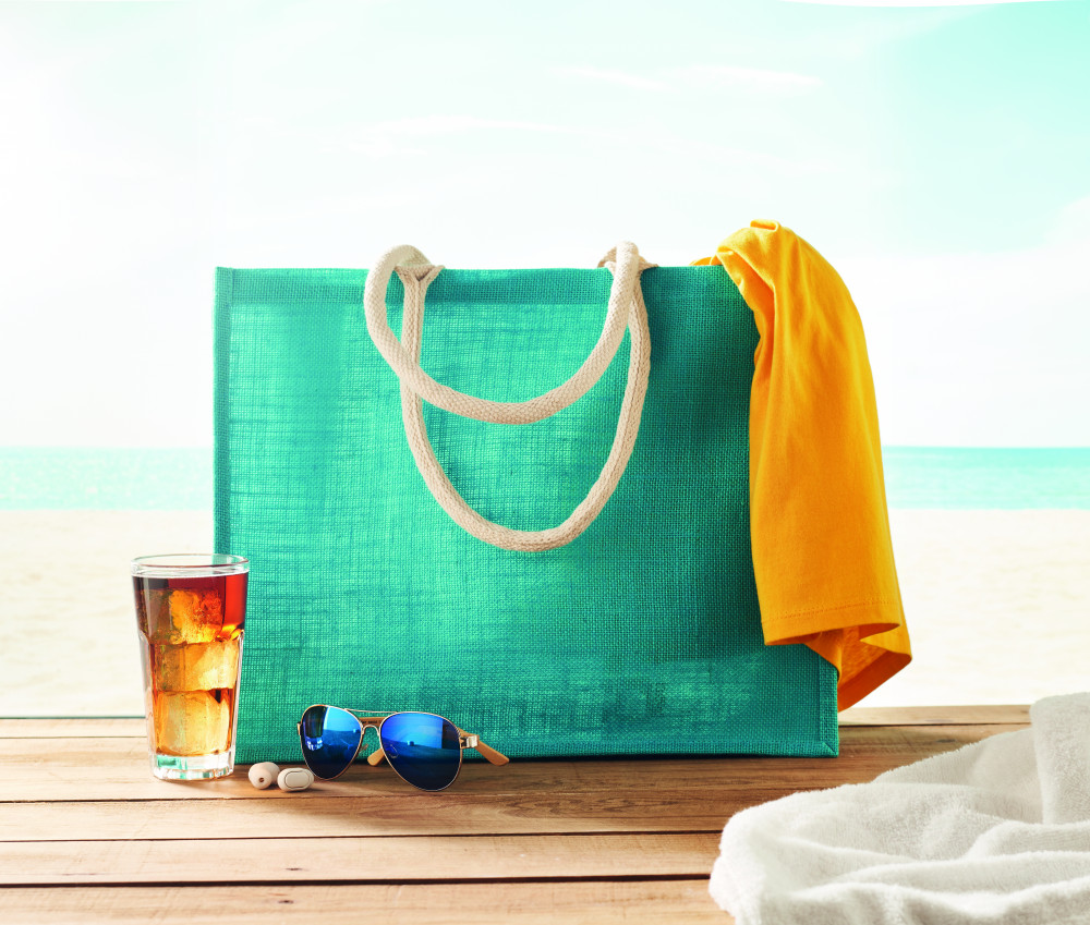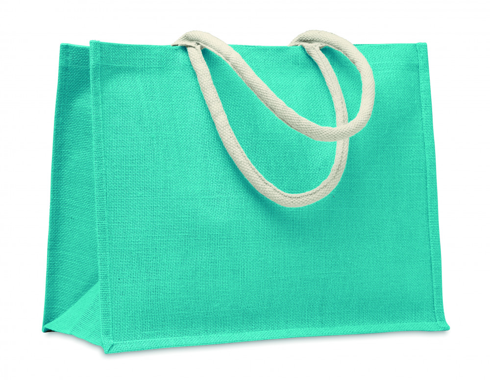 Juta laminált bevásárló- vagy strandtáska pamut füllel. Rövid fülekkel. Ez a termék OEKO-TEX® STANDARD 100 tanúsítvánnyal rendelkezik.