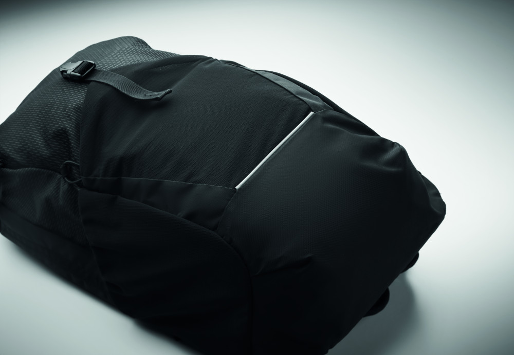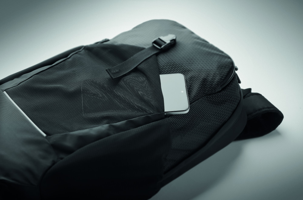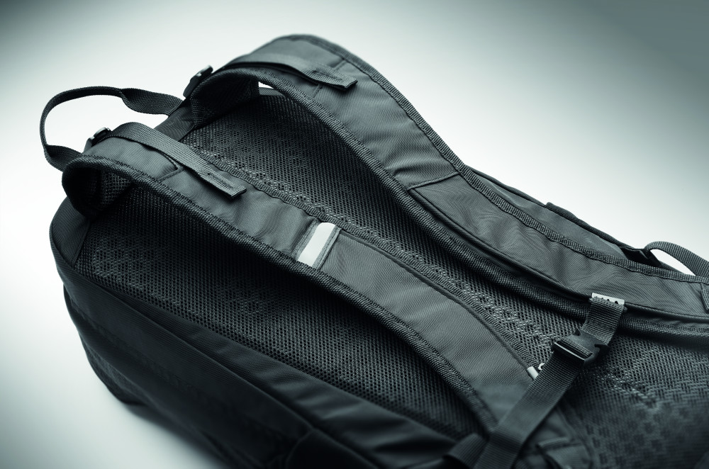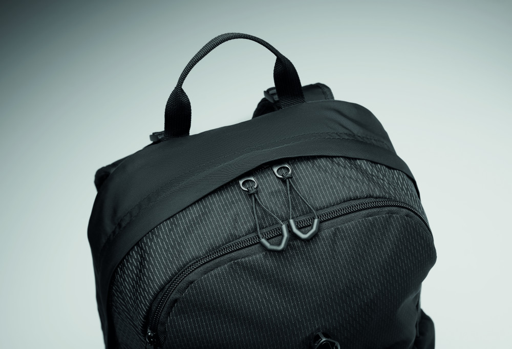 18 l-es túra hátizsák vízlepergető 420D nejlonból, fényvisszaverő csíkkal. Belső 15 colos laptop rekesszel. Egy cipzáras elülső rekesz és egy elülső nyitott zseb csattal. Két oldalsó nyitott zseb. Párnázott hát és vállpántok. Szellőző hátoldal.