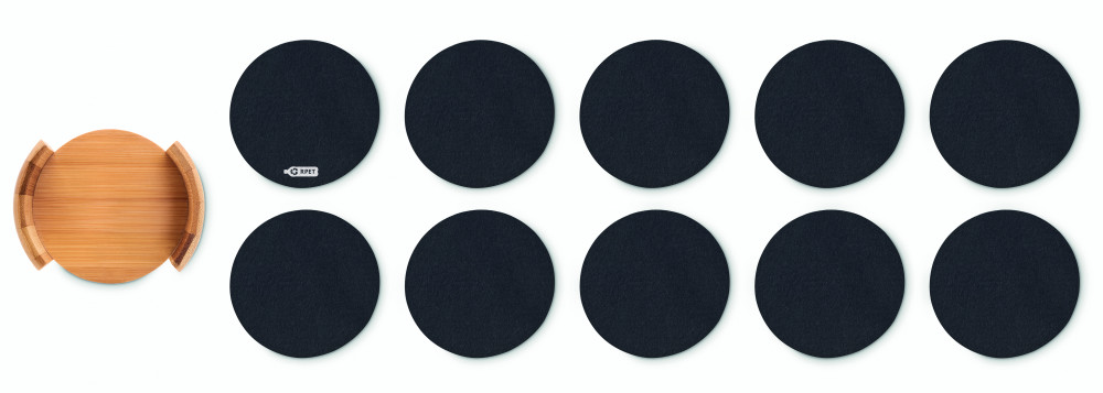 RPET filcből készült, 10 darabos poháralátét készlet bambusztartóban. A bambusz természetes anyag, színében, mintázatában és méretében esetenként eltérő lehet.