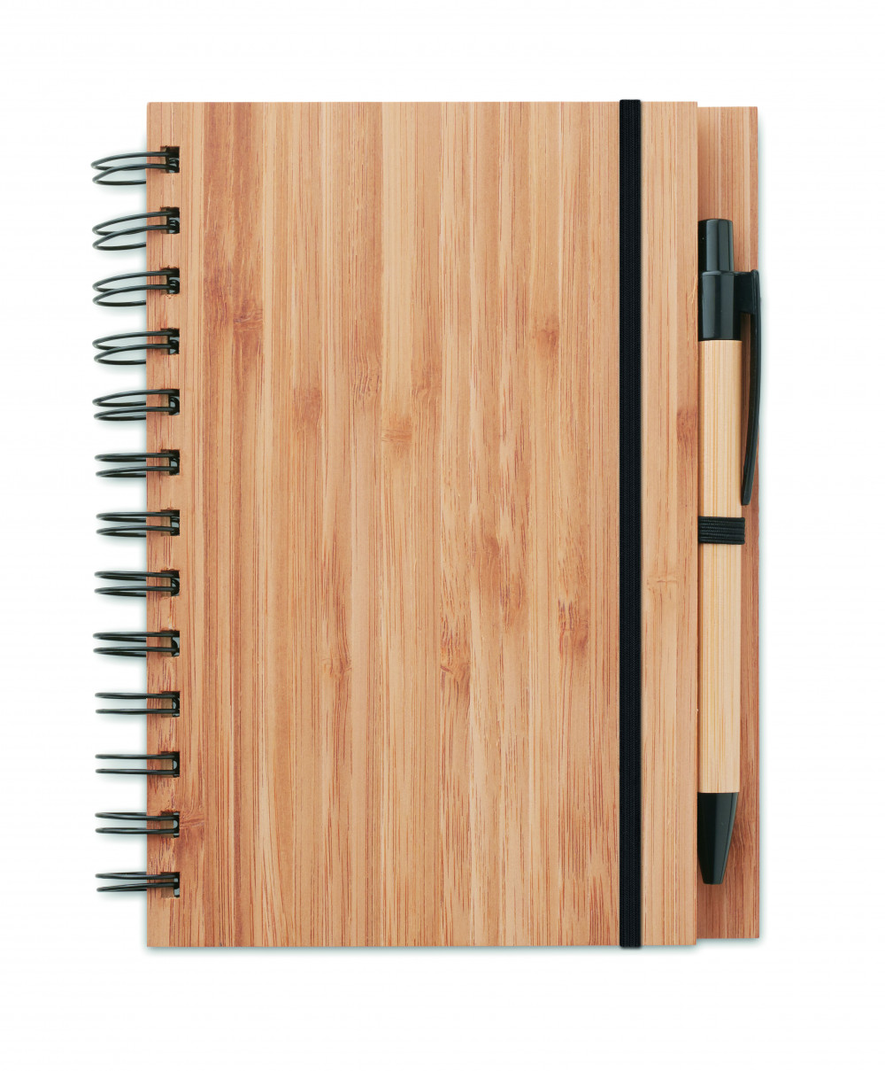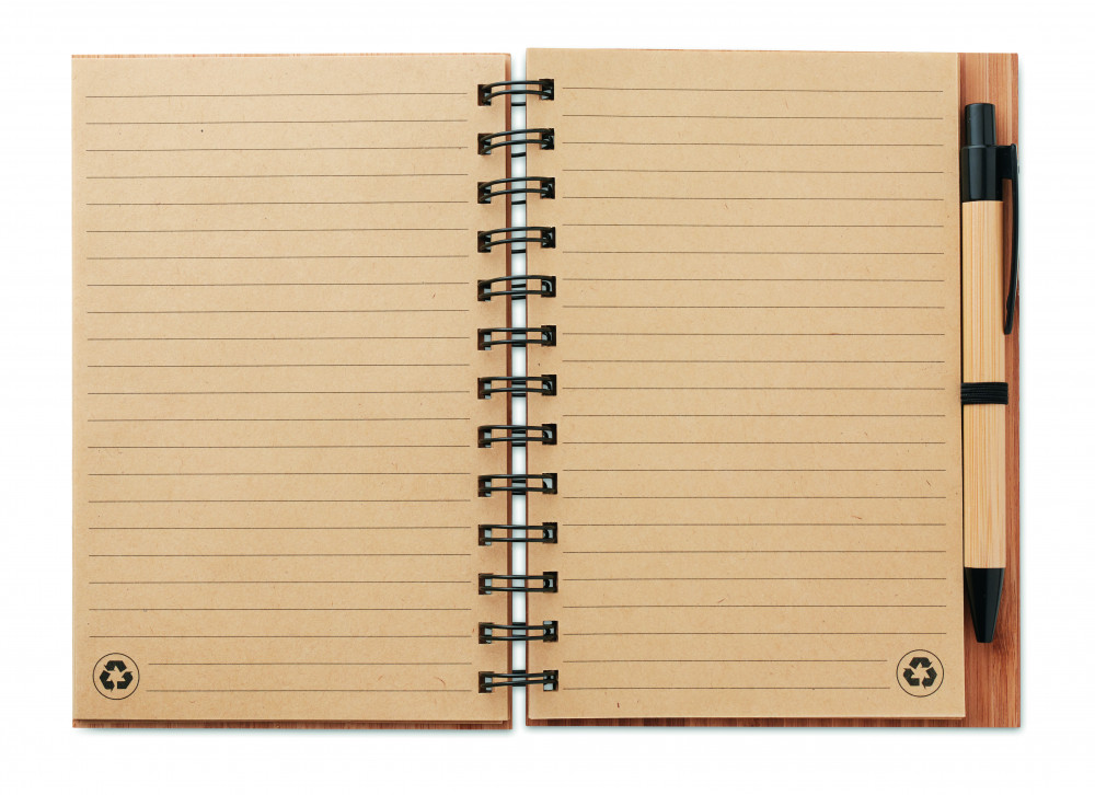 Bambusz borítójú jegyzetfüzet, hozzá illő tollal. Ikerspirálozott. 140 vonalas oldal (70 lap) újrahasznosított papírból. Hozzáillő nyomógombos golyóstoll bambusz tolltesttel és ABS szerelvényekkel. Elasztikus tolltartó hurok. A bambusz természetes anyag, a szín termékenként eltérő lehet. A bambusz természetes anyag, színében, mintázatában és méretében esetenként eltérő lehet. FSC®-certified | FSC 100%, N5.7, FSC-C213206