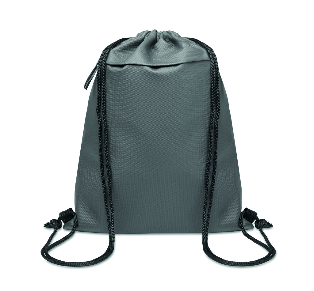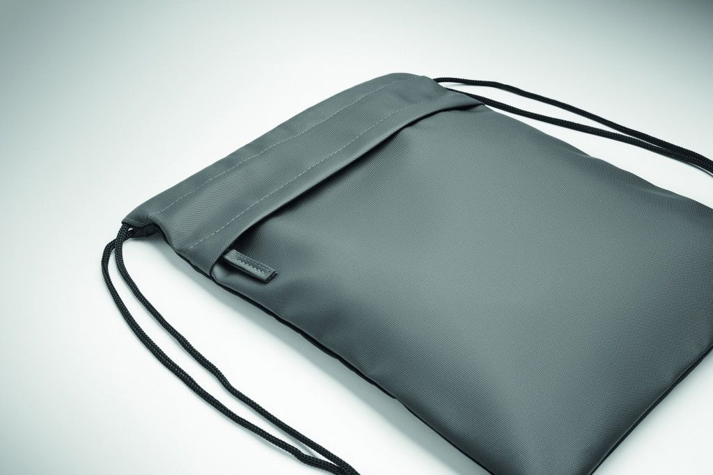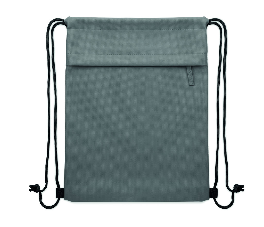 Húzózsinóros táska PU bevonatú 600D RPET poliészterből, 190T RPET poliészter béléssel. Cipzáras elülső zsebbel.