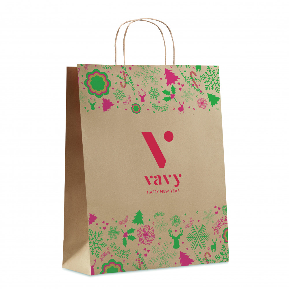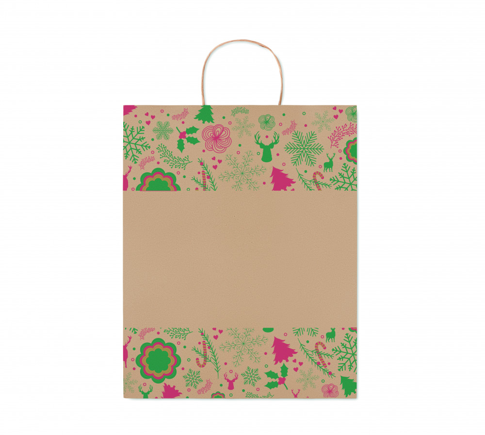 Nagy papír karácsonyi ajándéktasak. 90 g vastag, 50%-ban újrahasznosított papír. EU-ban gyártva. Egy tetszetősen becsomagolt ajándékot átadni már fél siker! Használja ezt a karácsonyi papír ajándéktasakot, hogy megadja a végső simítást ajándékának. FSC®-certified | FSC MIX, P5.3, FSC-C213206