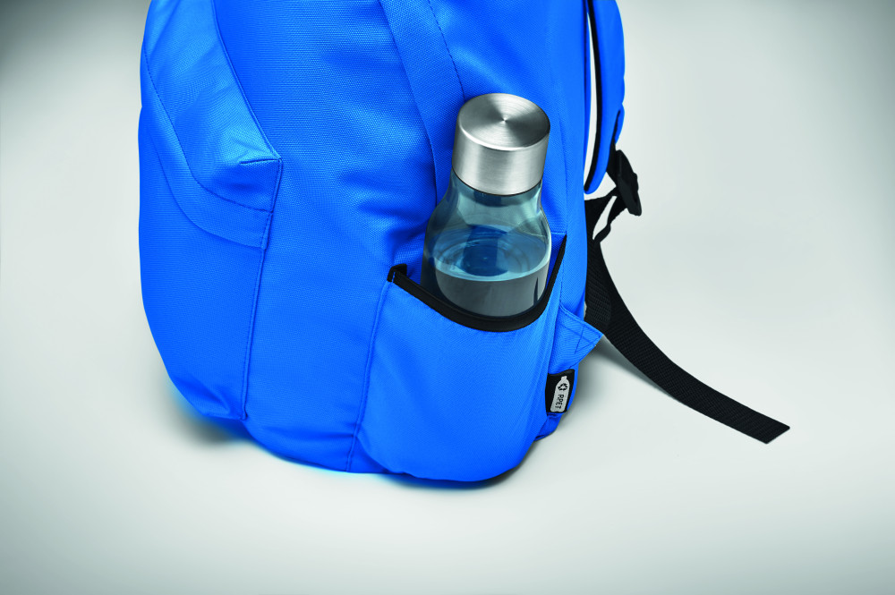 Hátizsák 600D RPET poliészterből, cipzáras külső zsebbel. Párnázott hátoldallal és oldalsó palacktartóval rendelkezik.