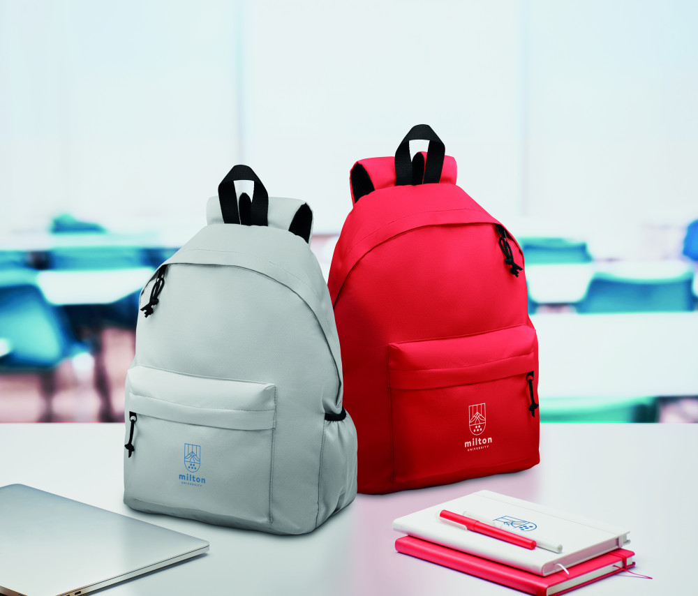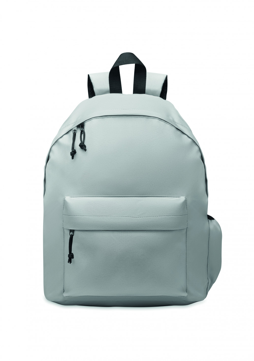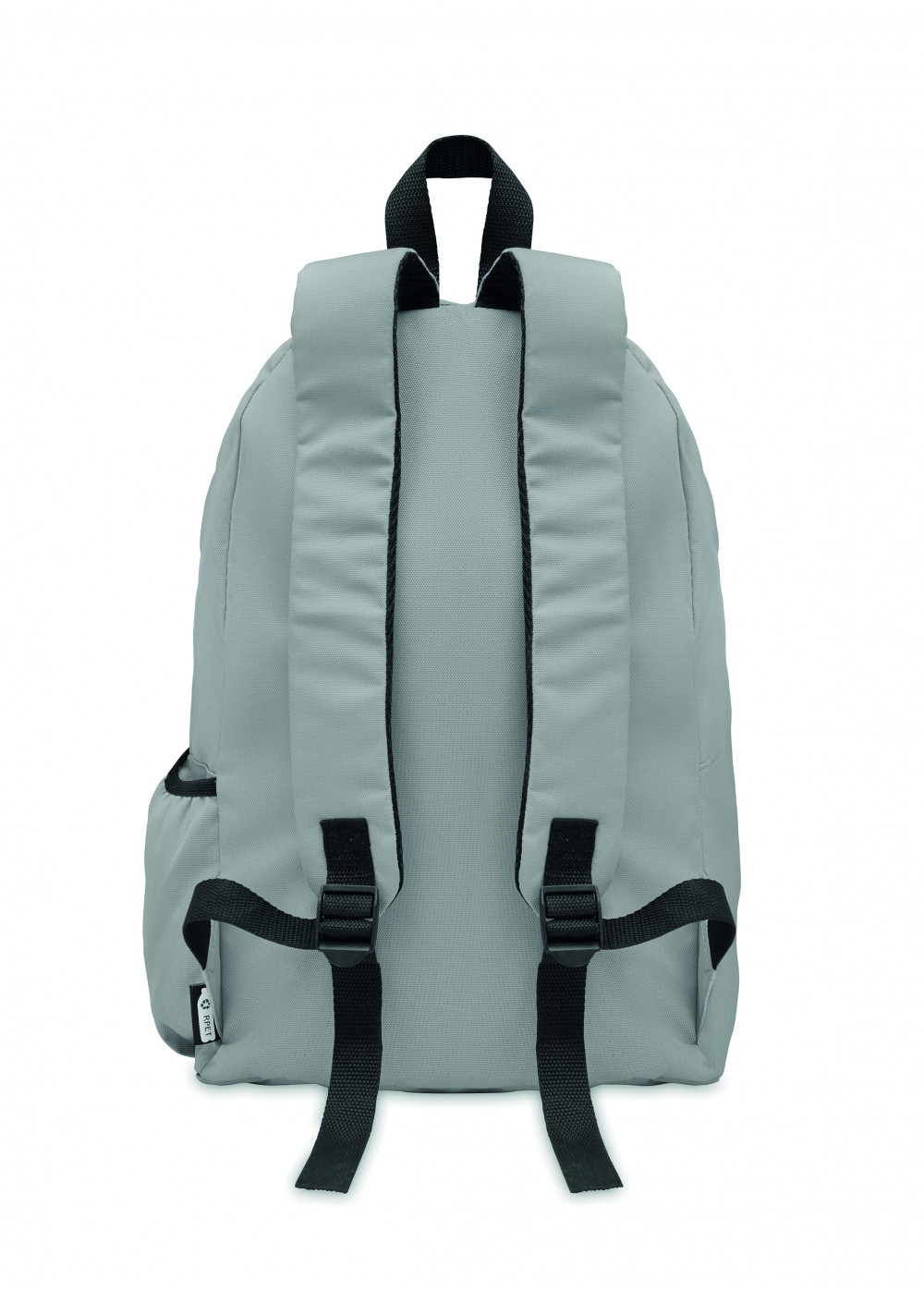 Hátizsák 600D RPET poliészterből, cipzáras külső zsebbel. Párnázott hátoldallal és oldalsó palacktartóval rendelkezik.