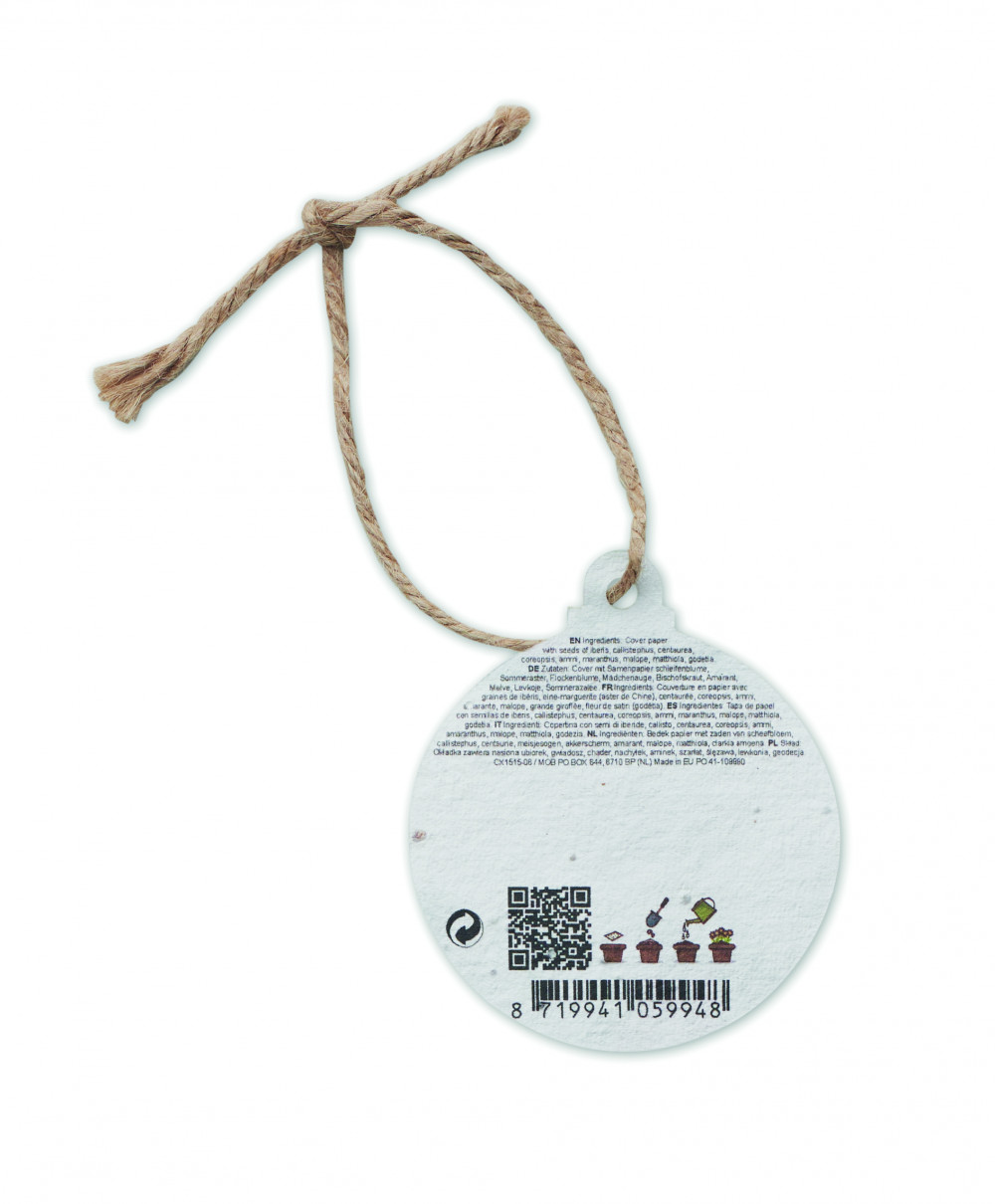 Karácsonyi gömbdíszt formázó, magpapír függődísz, vadvirág magkeverékkel, juta zsinórral. Használat után elültetve a magvakból vadvirágok hajtanak ki. EU-ban gyártva. Díszítse fel karácsonyfáját vagy otthonát ezzel a papírdísszel. Az ünnepek után a díszt elültetve vadvirágok keverékét termesztheti kertjében vagy erkélyén. Egy igazán fenntartható és újrahasznosított tárgy!