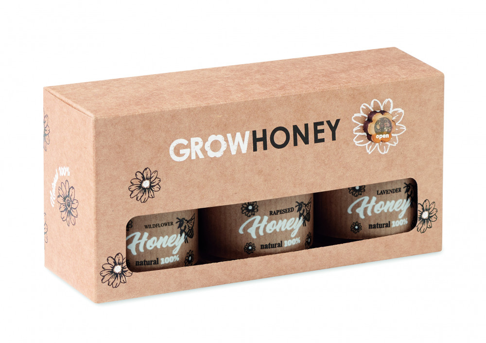 3 természetes mézből álló összeállítás, fából készült mézcsurgatóval. Vadvirág, levendula és repceméz (egyenként 50 g). Kraftpapír dobozban. Méhlegelő virágmagokkal együtt. EU-ban készült.