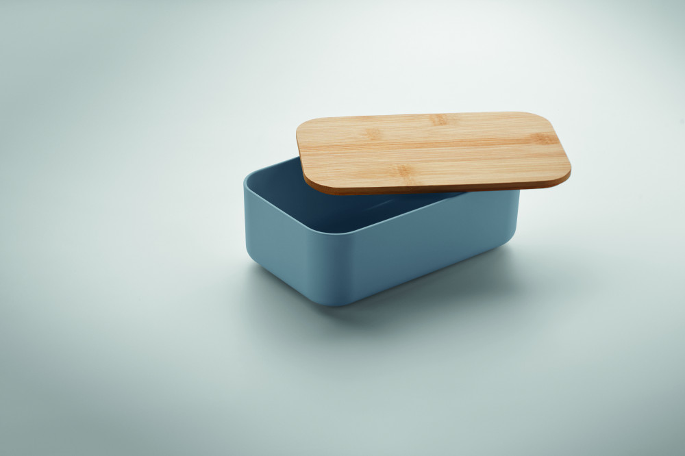 100% kukorica PLA uzsonnás doboz bambuszfedéllel és RPET elasztikus rögzítőpánttal. Űrtartalom: 1000 ml.