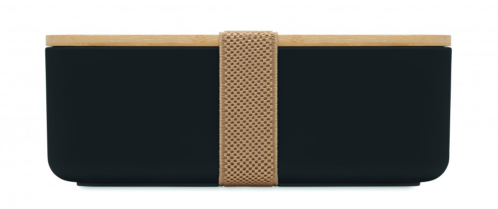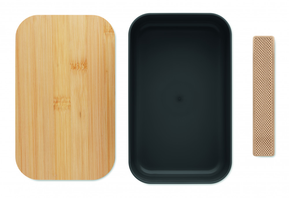 100% kukorica PLA uzsonnás doboz bambuszfedéllel és RPET elasztikus rögzítőpánttal. Űrtartalom: 1000 ml.