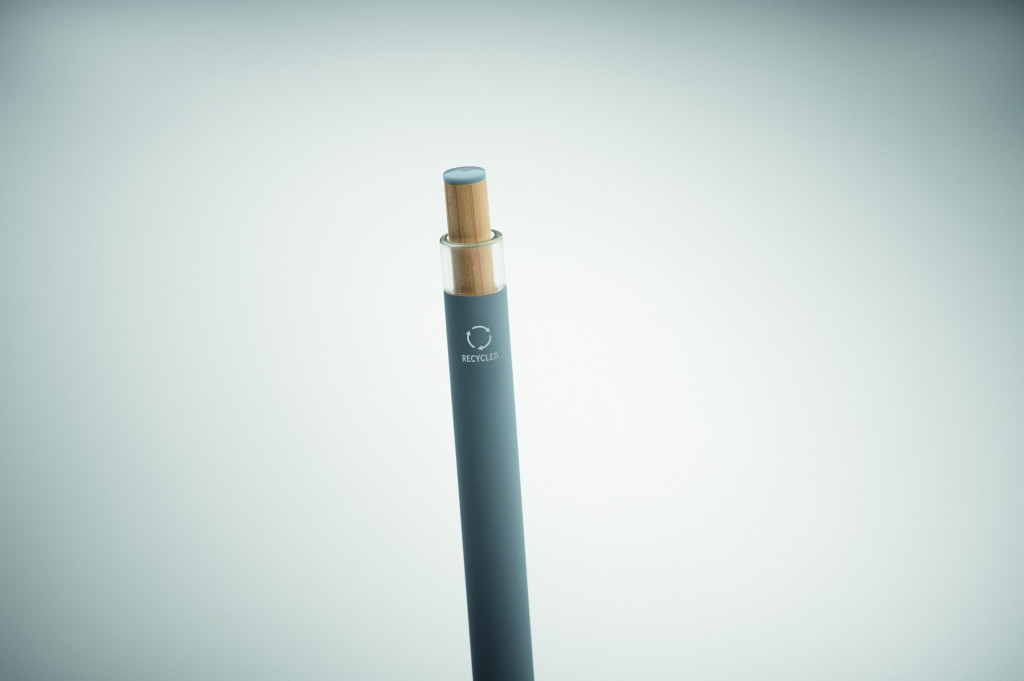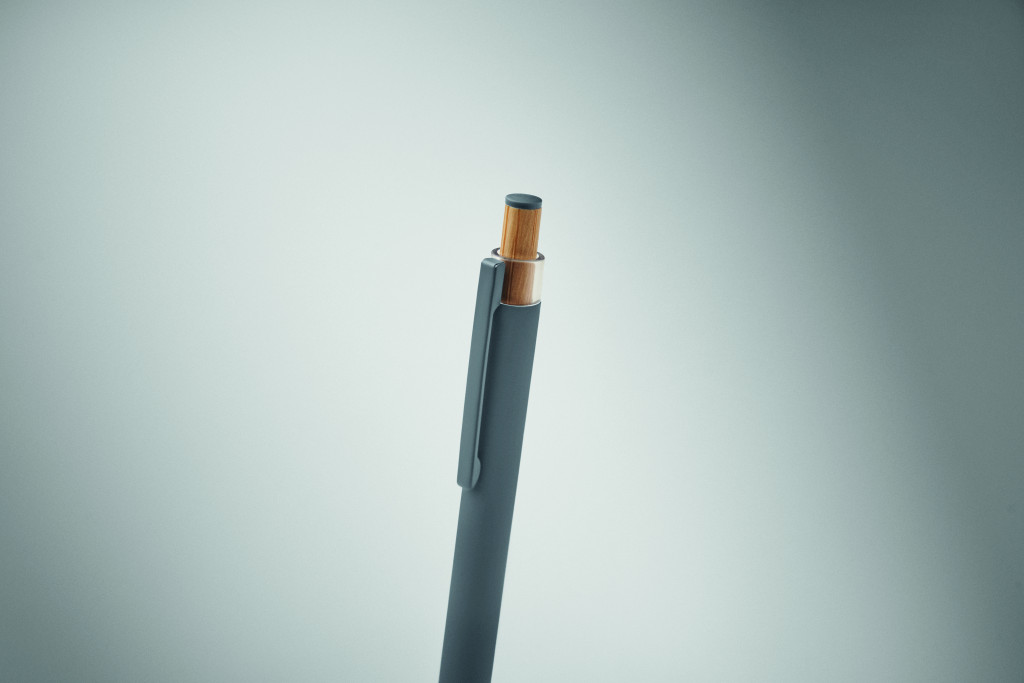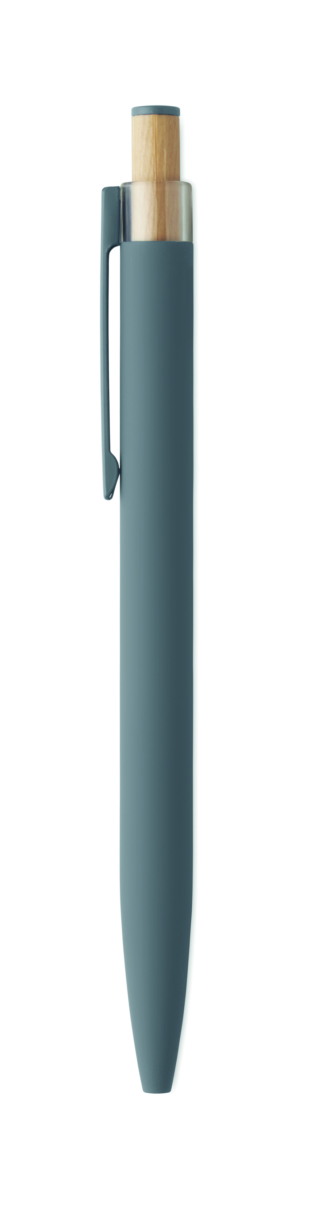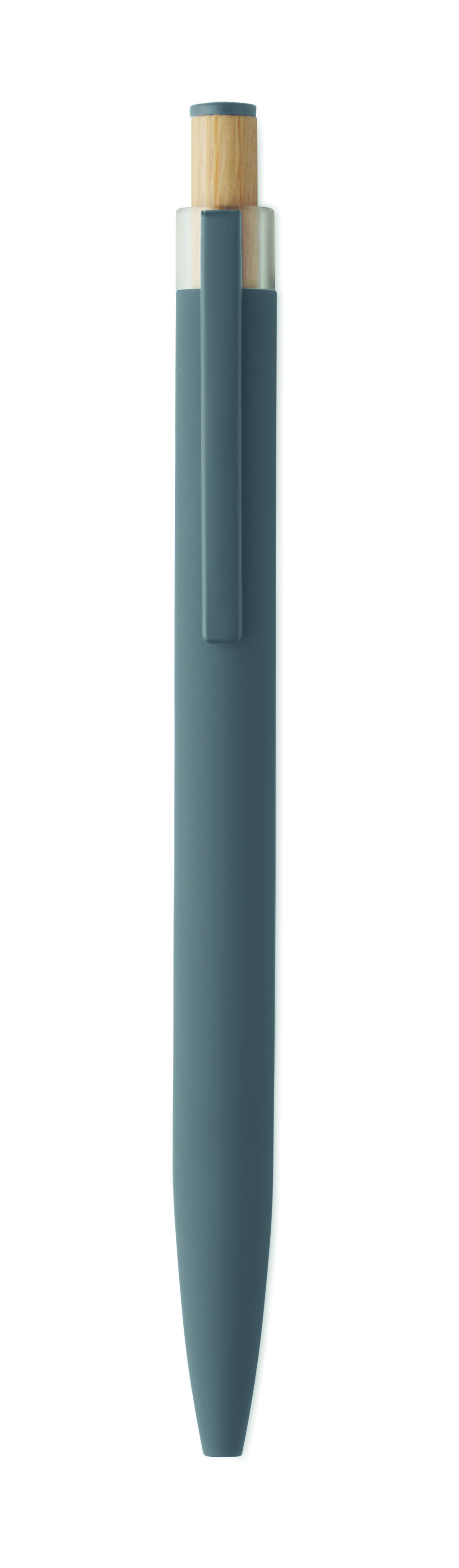 Újrahasznosított alumínium golyóstoll, színazonos tetejű, bambusz nyomógombbal, színazonos fém csíptetővel. Kéken író betéttel.