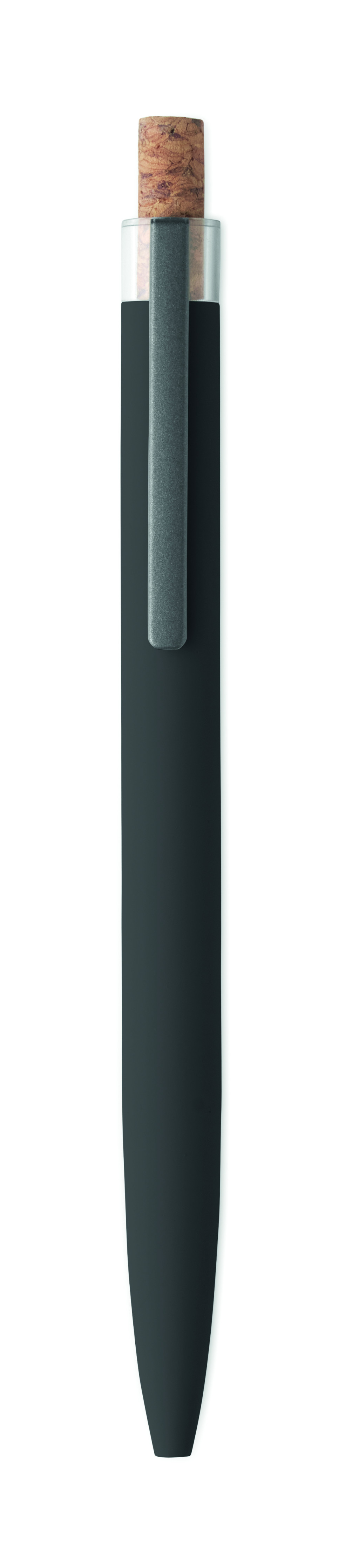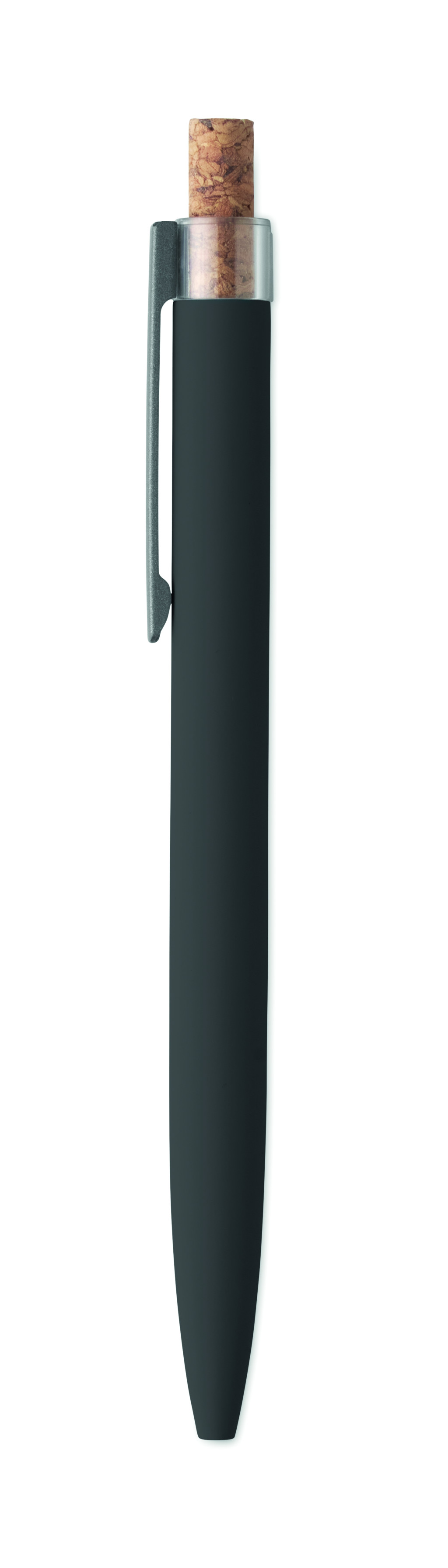 Újrahasznosított alumínium golyóstoll, színazonos tetejű, parafa nyomógombbal, színazonos fém csíptetővel. Kéken író betéttel.