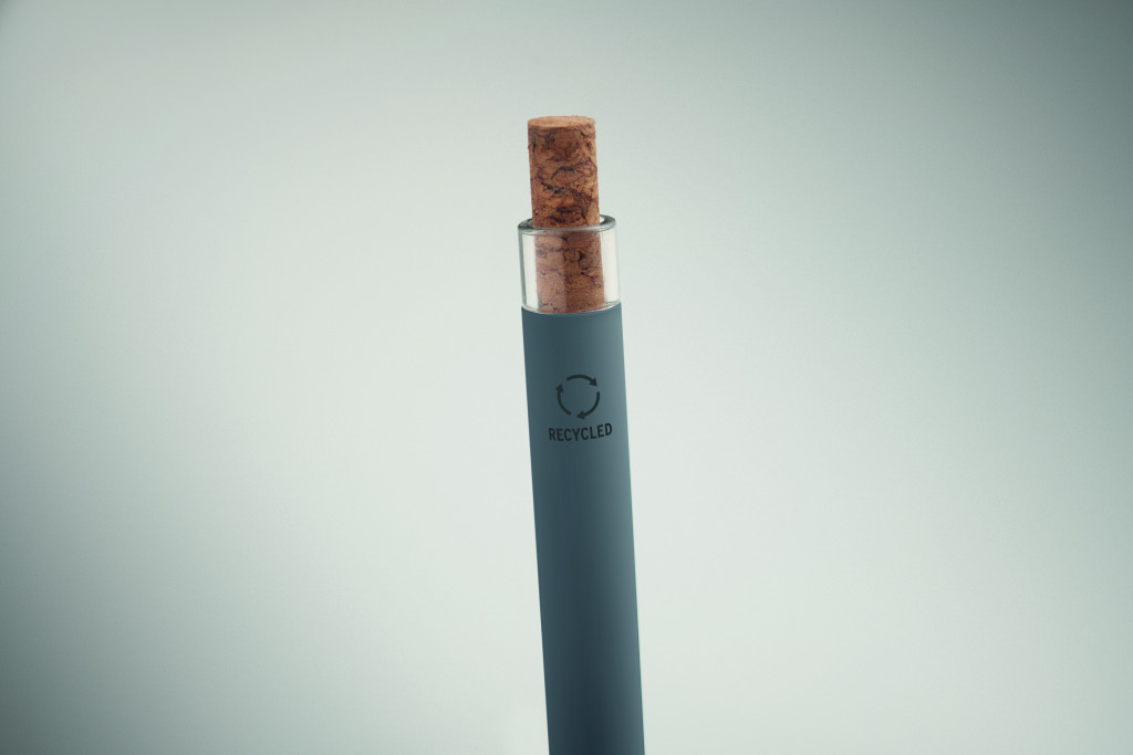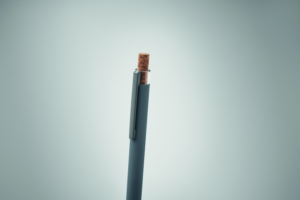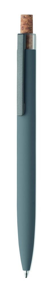 Újrahasznosított alumínium golyóstoll, színazonos tetejű, parafa nyomógombbal, színazonos fém csíptetővel. Kéken író betéttel.