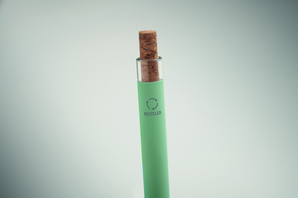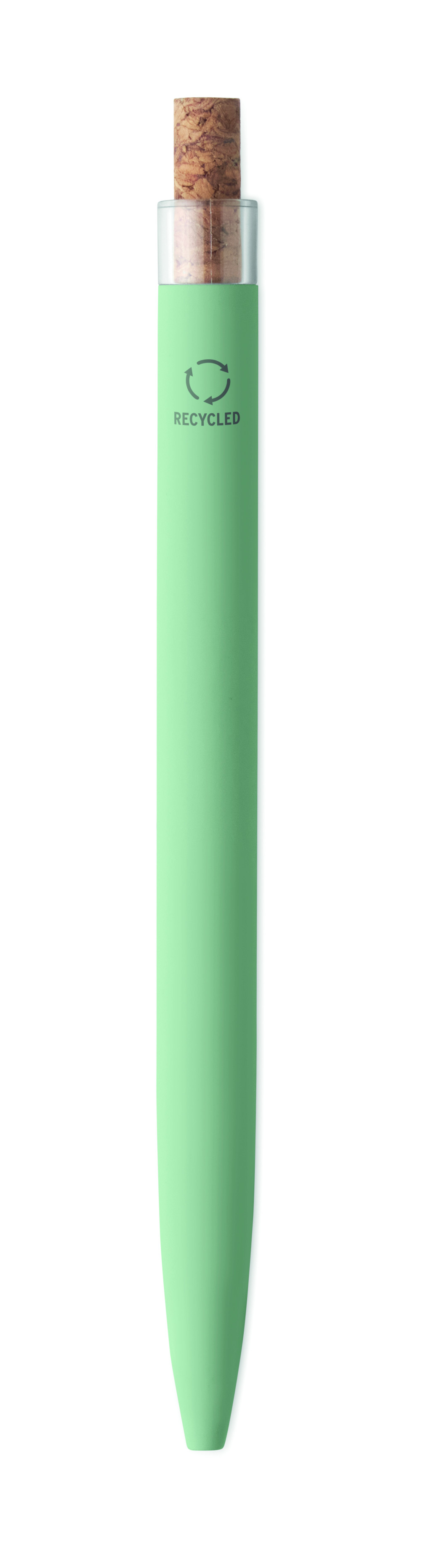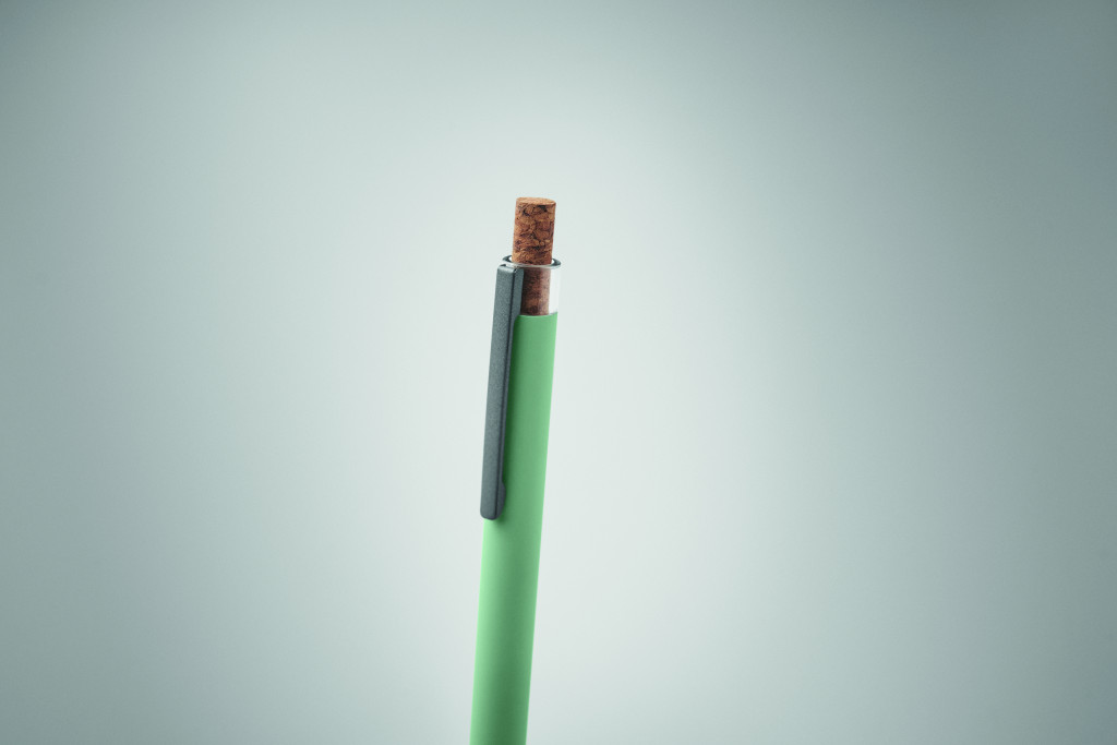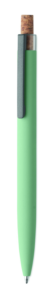 Újrahasznosított alumínium golyóstoll, színazonos tetejű, parafa nyomógombbal, színazonos fém csíptetővel. Kéken író betéttel.