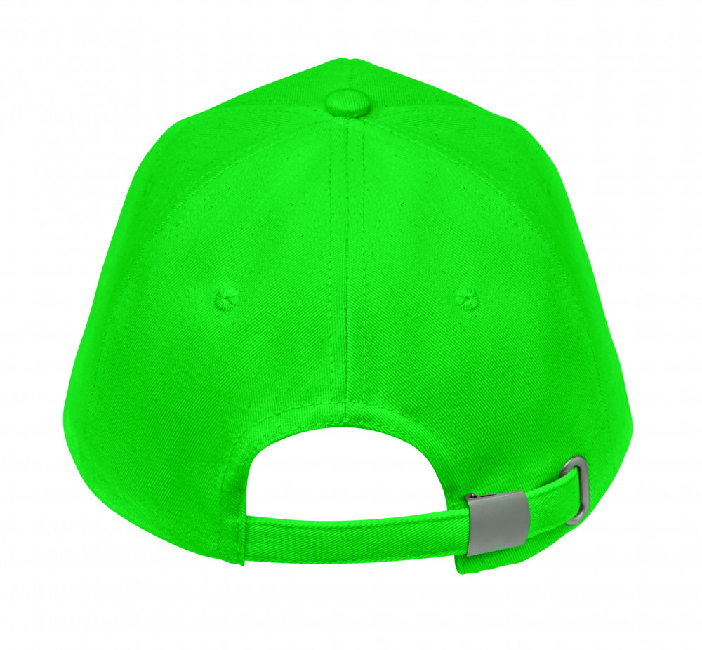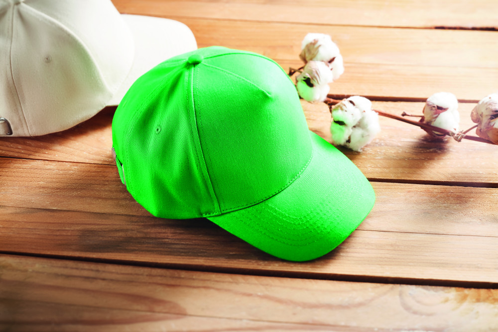 5 paneles baseball sapka 250 g vastag bio szálcsiszolt pamutból, hátul fém csattal záródó állítható pánttal.