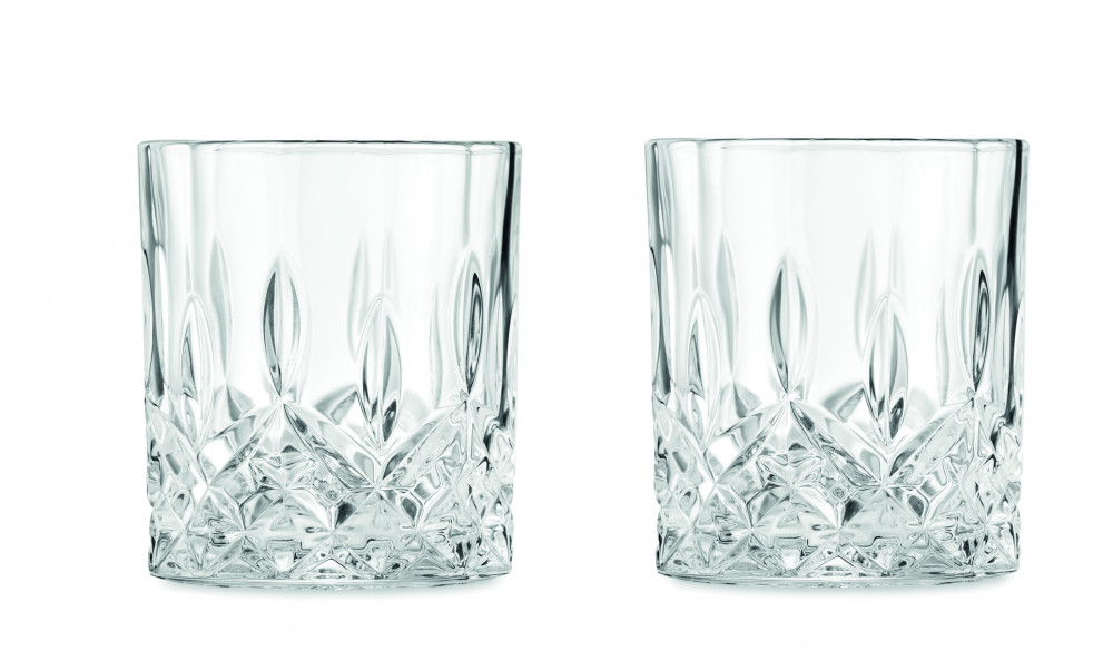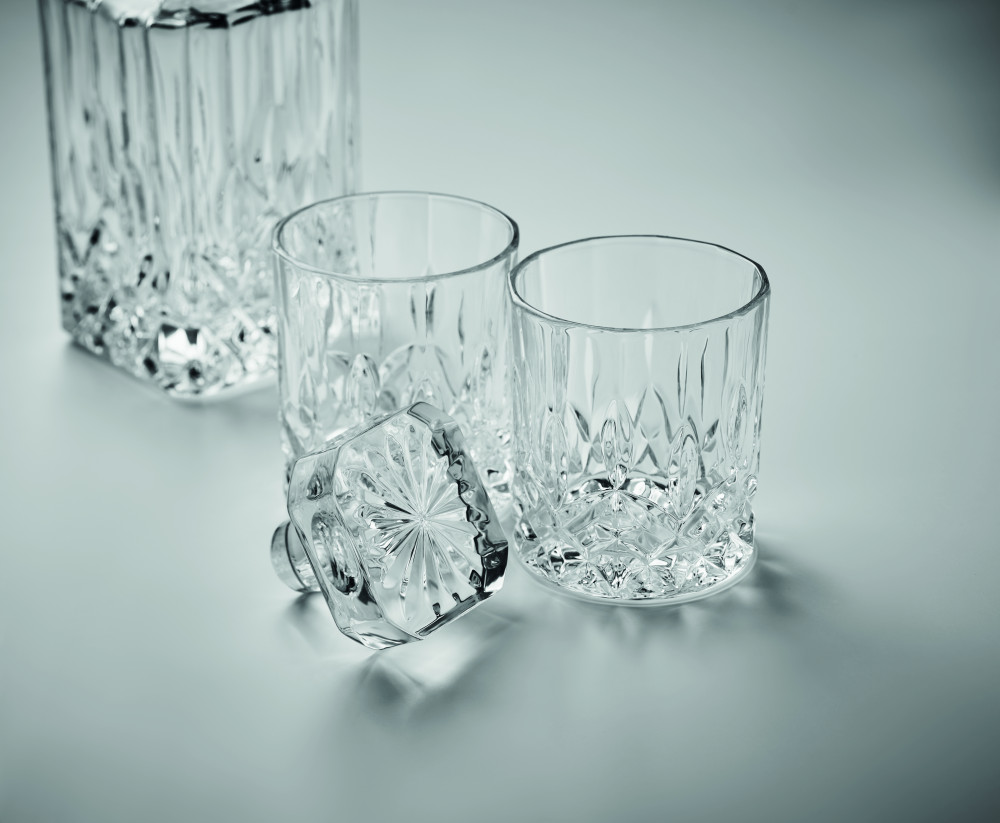 Luxus whisky készlet faládát mintázó tálcával. 700 ml-es üveg dekantert, 2 db 300 ml-es whiskys poharat, 6 többször használható kő jégkockát és fogót tartalmaz.