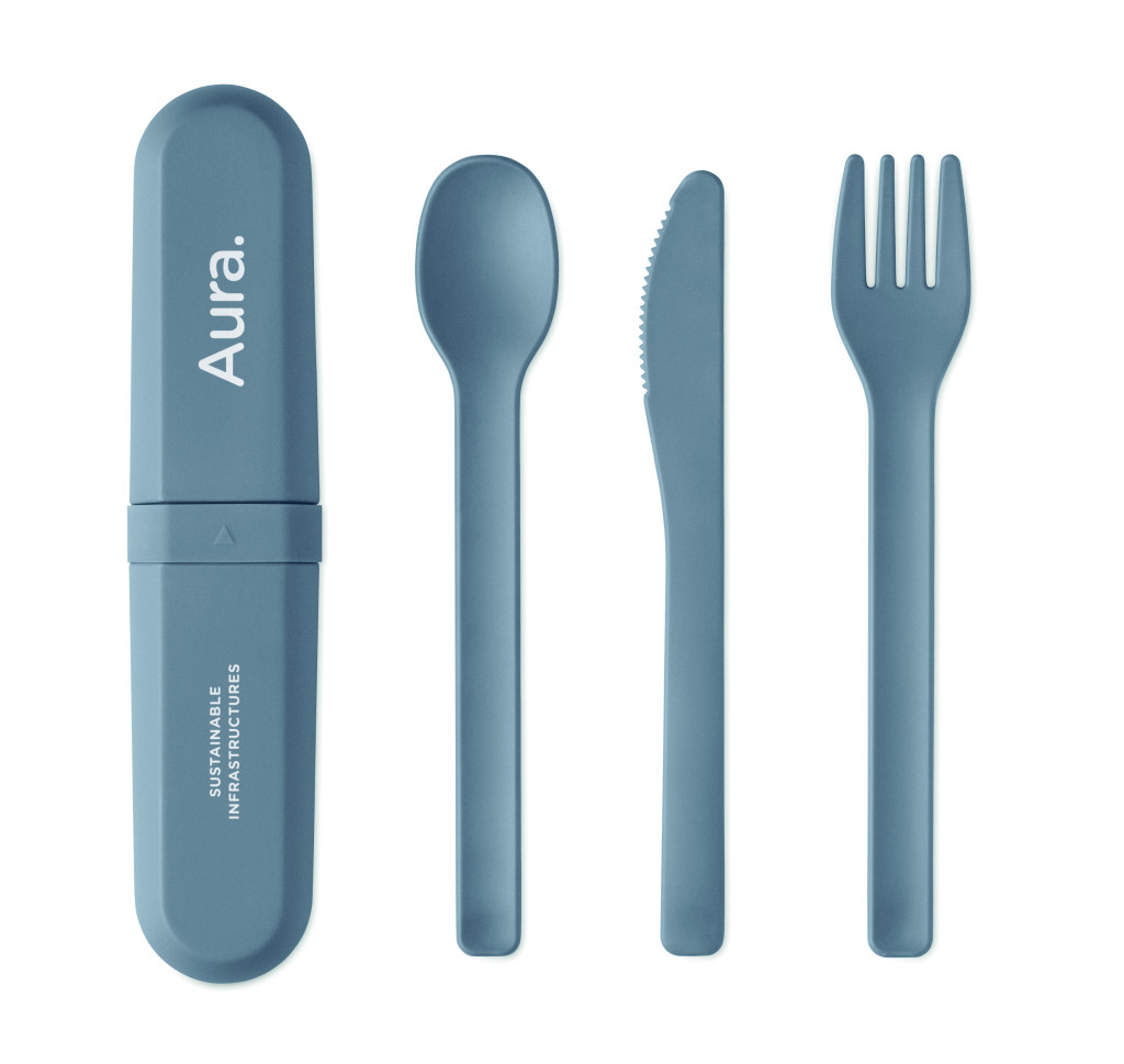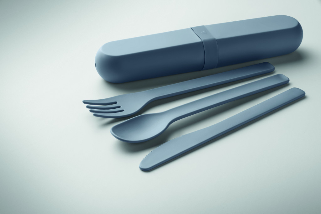 Többször felhasználható, kukorica PLA-ból készült evőeszközkészlet tokkal. Villát, kést, kanalat és egy praktikus tokot tartalmaz.