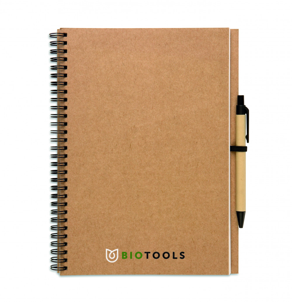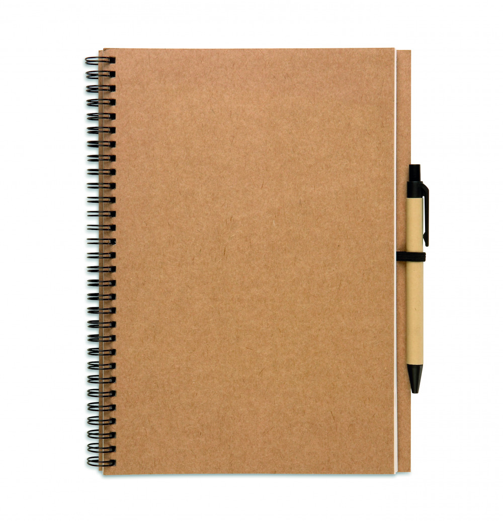 Újrahasznosított papír jegyzetfüzet tollal. Ikerspirálozott. 140 sima oldal (70 lap) újrahasznosított papírból. Fekete elasztikus tolltartó hurok. Nyomógombos golyóstoll újrahasznosított karton tolltesttel, biológiailag lebomló műanyag szerelvényekkel. Kéken író betéttel.