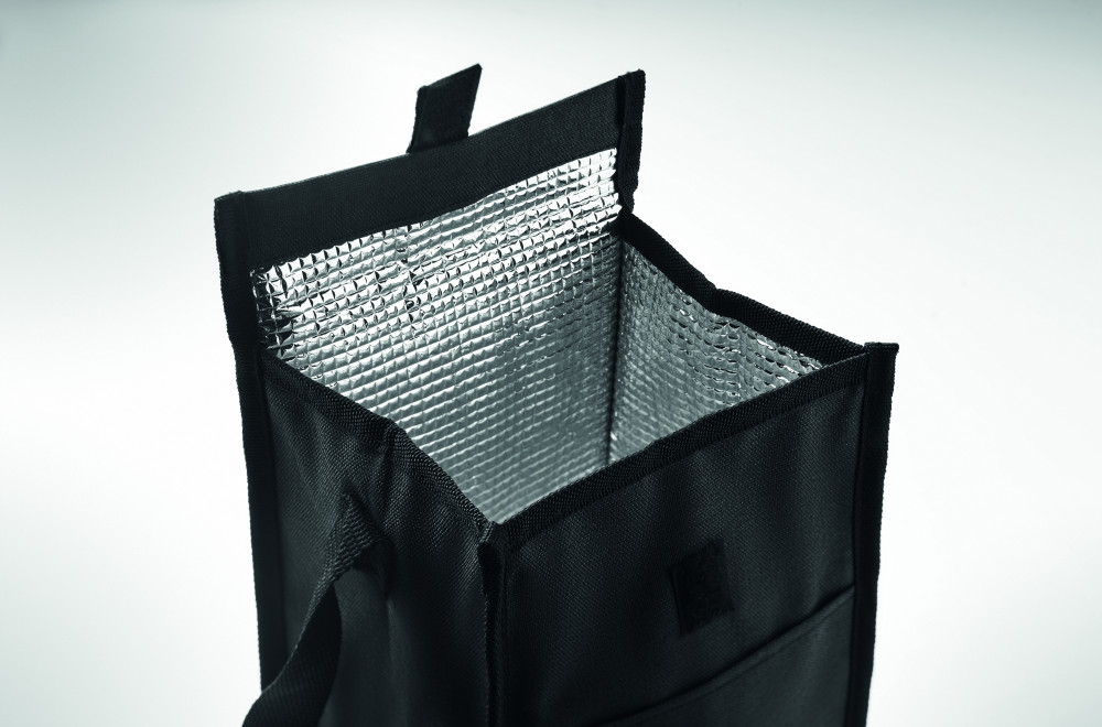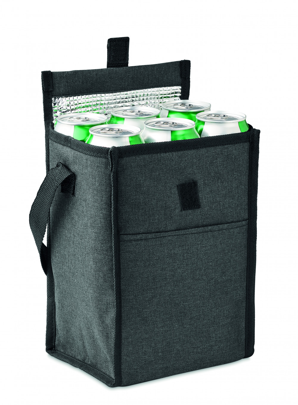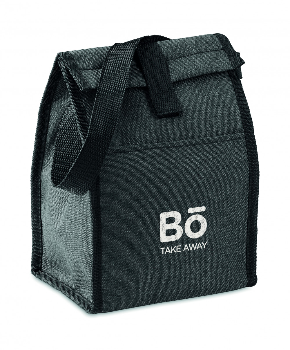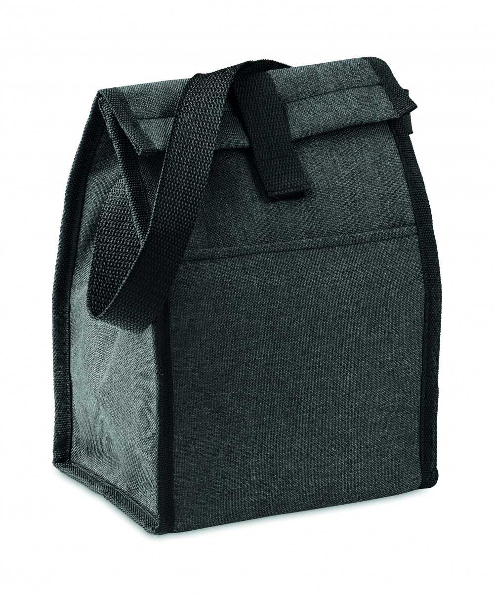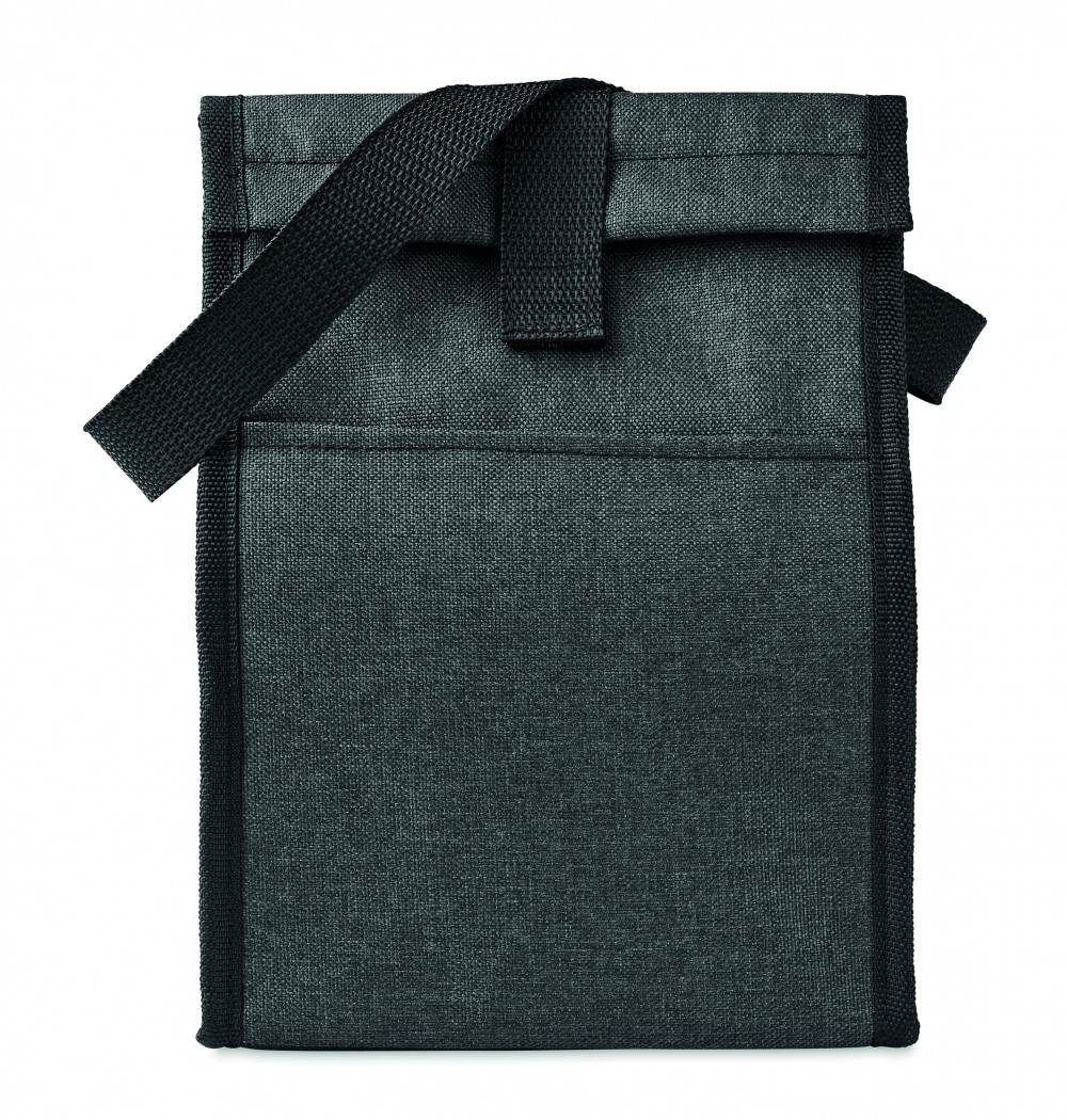 Hőszigetelt uzsonnástáska 600D RPET anyagból, elülső zsebbel. Kapacitás 3 l. Szigetelőanyag: 2 mm-es PE hab alumíniumfóliával.
