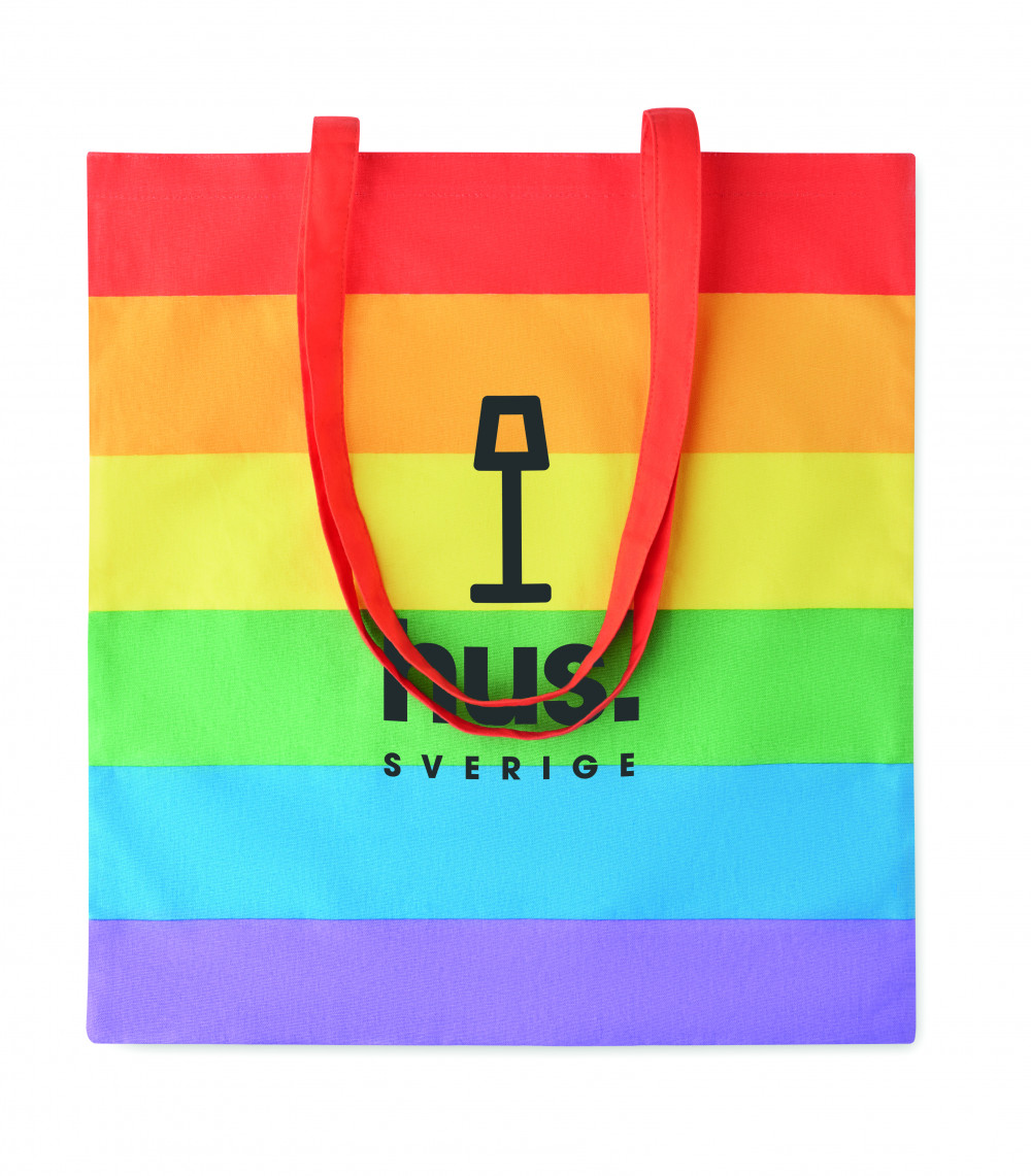 200 g vastag szivárványszínű pamut bevásárlótáska hosszú füllel. Adjon egy kis színt márkájának vagy különleges üzenetének ezzel a vidám bevásárlótáskával. Ez a táska ideális a napi bevásárláshoz. A hosszú füleknél fogva hordozhatja, vagy a vállára akaszthatja, hogy a keze szabadon maradjon. Teherbírás 2,5 kg. Ez a termék OEKO-TEX® STANDARD 100 tanúsítvánnyal rendelkezik.