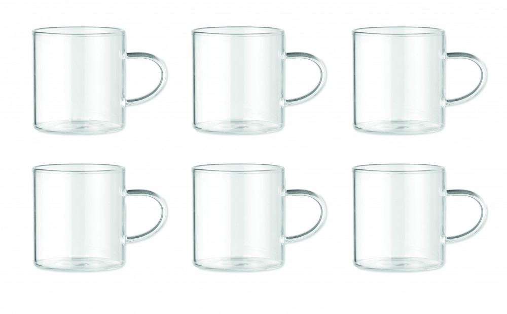 Készlet bambusz bögretartóval és 6 boroszilikát üvegbögrével. Űrtartalom: 200 ml / bögre. A termék összeszerelést igényel. A bambusz természetes anyag, színében, mintázatában és méretében esetenként eltérő lehet.