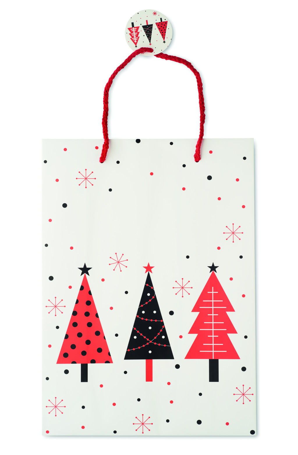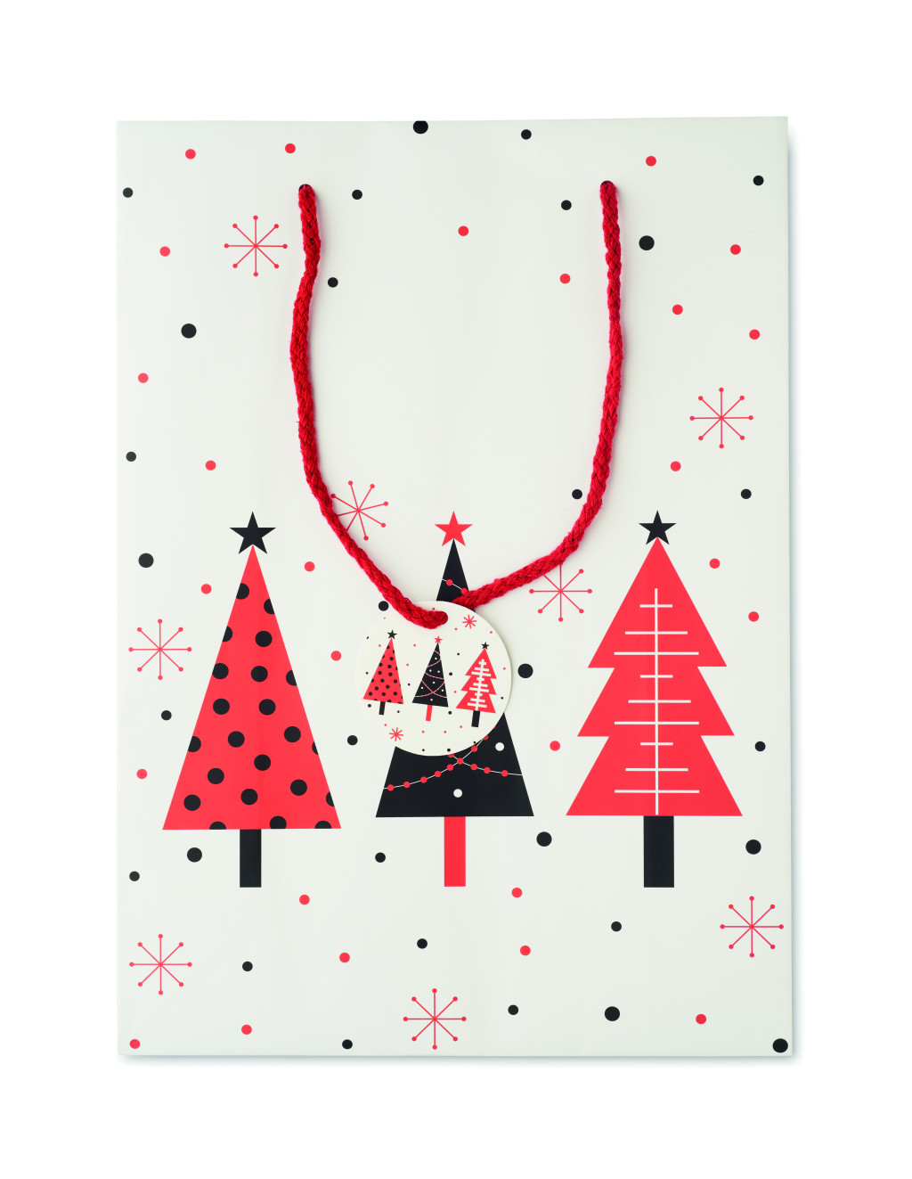 Nagyméretű, karácsonyi ajándéktasak papírból (30%-ban újrahasznosított), ajándék kísérő címkével. 150 g/m². FSC®-certified | FSC MIX, W5.3, FSC-C213206