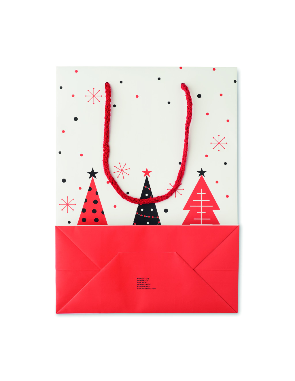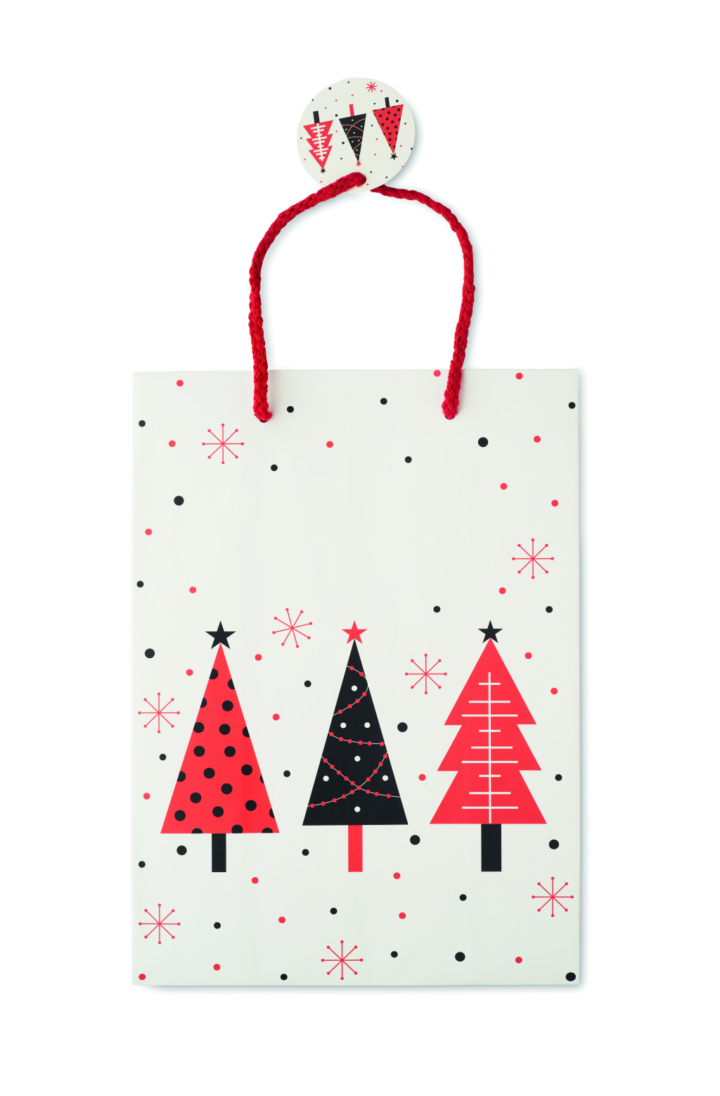 Közepes méretű, karácsonyi ajándéktasak papírból (30%-ban újrahasznosított), ajándék kísérő címkével. 150 g/m². FSC®-certified | FSC MIX, W5.3, FSC-C213206