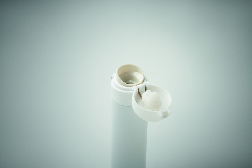 Duplafalú palack újrahasznosított rozsdamentes acélból (90% újrahasznosított rozsdamentes acél és 10% rozsdamentes acél), biztonsági zárral a fedélen és nyomógombos nyitási opcióval. Szivárgásmentes. Űrtartalom: 300 ml.