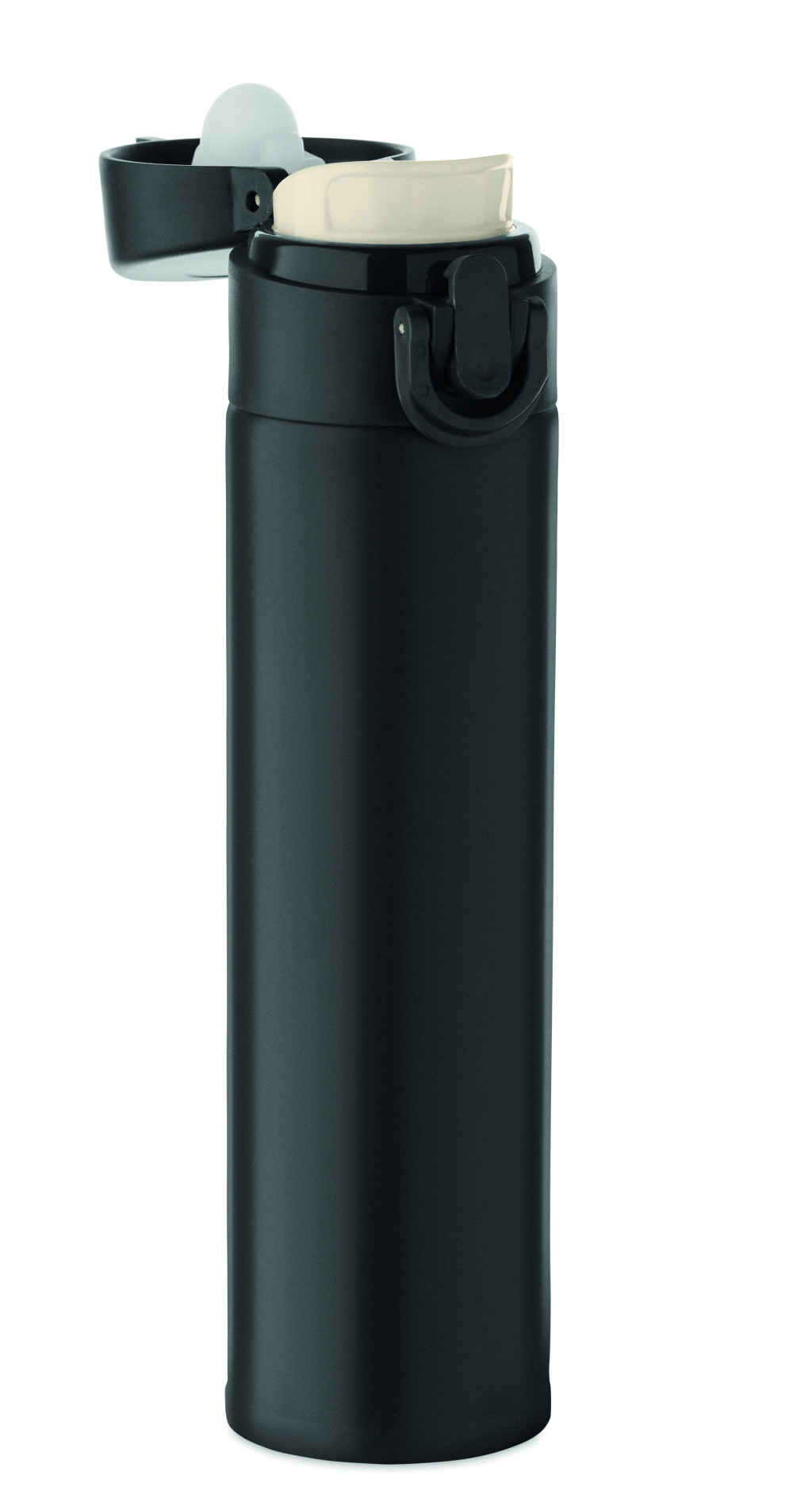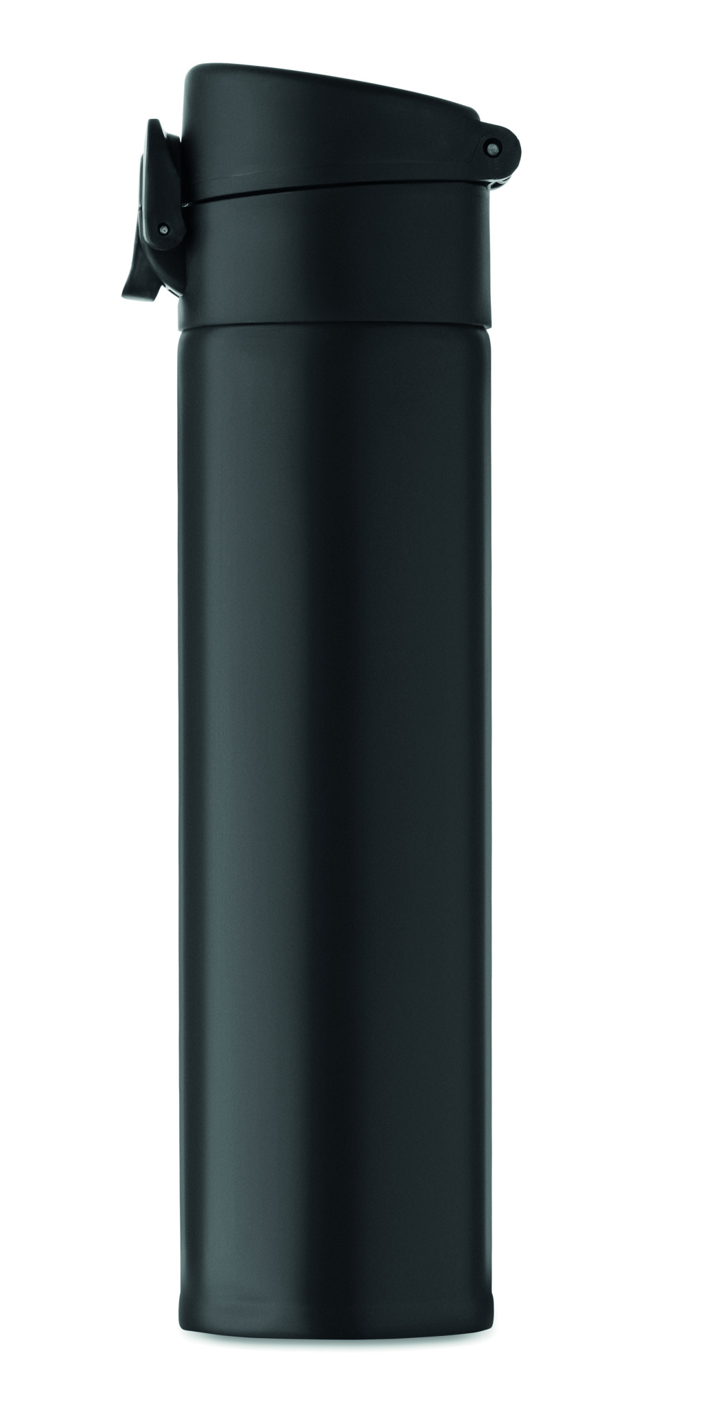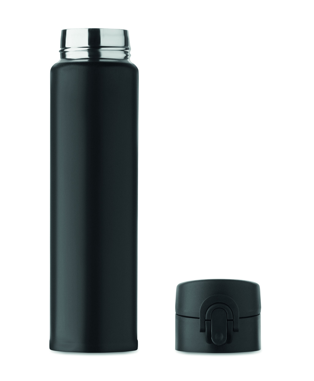 Duplafalú palack újrahasznosított rozsdamentes acélból (90% újrahasznosított rozsdamentes acél és 10% rozsdamentes acél), biztonsági zárral a fedélen és nyomógombos nyitási opcióval. Szivárgásmentes. Űrtartalom: 300 ml.