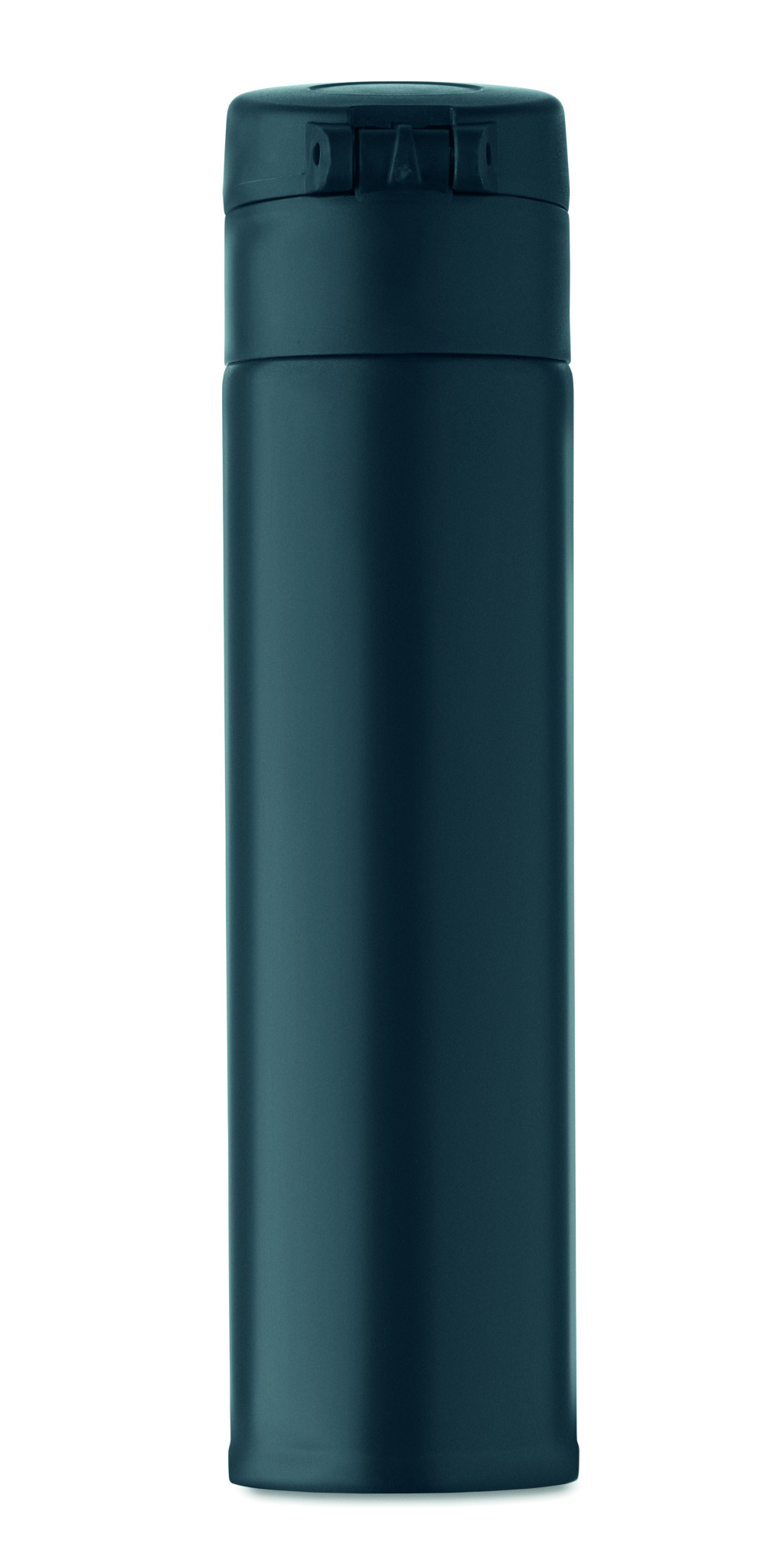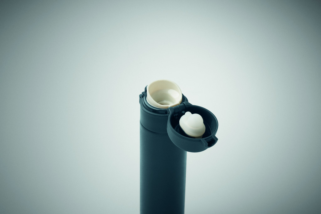 Duplafalú palack újrahasznosított rozsdamentes acélból (90% újrahasznosított rozsdamentes acél és 10% rozsdamentes acél), biztonsági zárral a fedélen és nyomógombos nyitási opcióval. Szivárgásmentes. Űrtartalom: 300 ml.