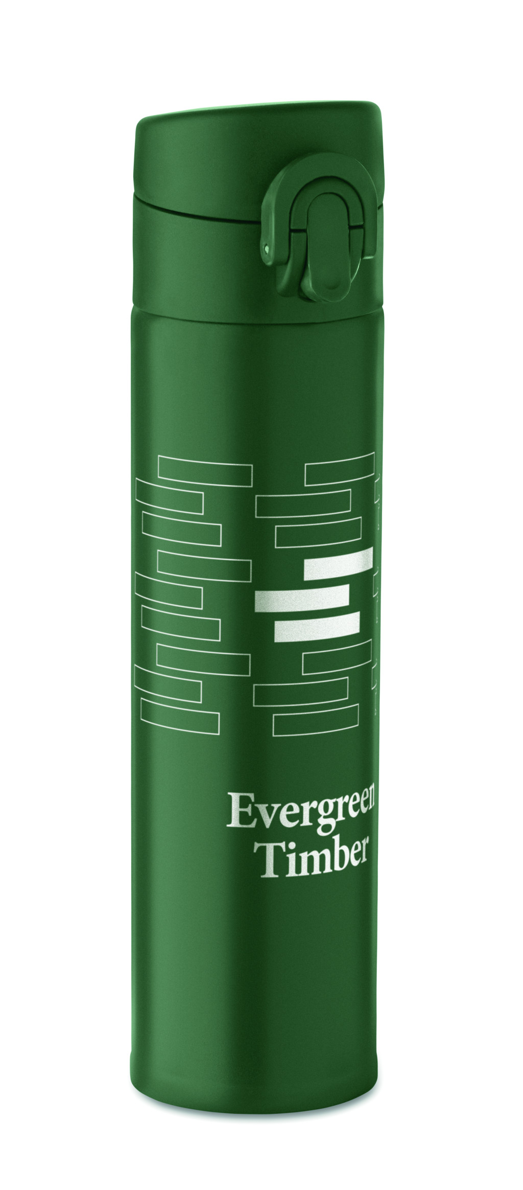 Duplafalú palack újrahasznosított rozsdamentes acélból (90% újrahasznosított rozsdamentes acél és 10% rozsdamentes acél), biztonsági zárral a fedélen és nyomógombos nyitási opcióval. Szivárgásmentes. Űrtartalom: 300 ml.