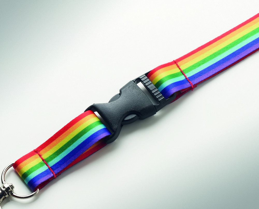 Szivárványszínű RPET nyakpánt fém kapoccsal, levehető csattal és biztonsági oldózárral.