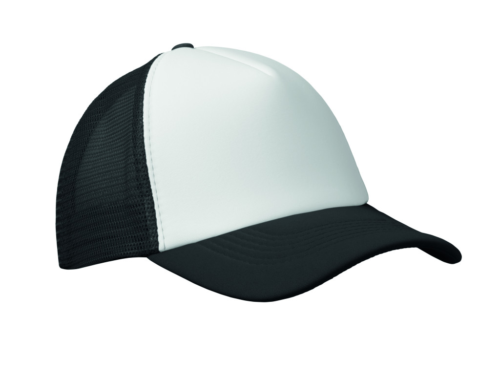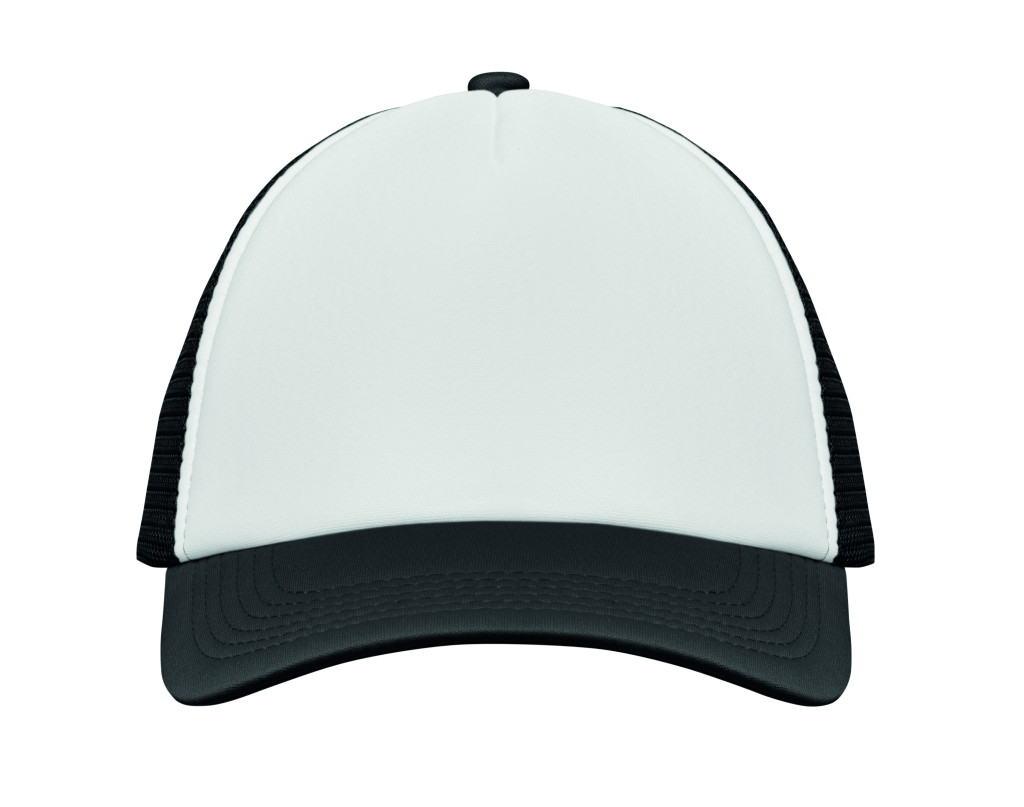 5 paneles poliészter 140-150 gr/m2 kamionos sapka. Állítható műanyag zárórész. Fehér elülső panel és színes napellenző jersey poliészter anyagból. A többi panel hálós anyagból. Méret: 7 1/4.