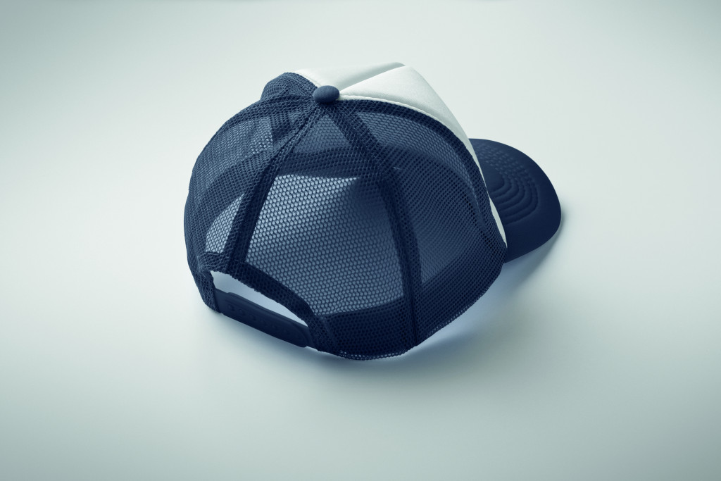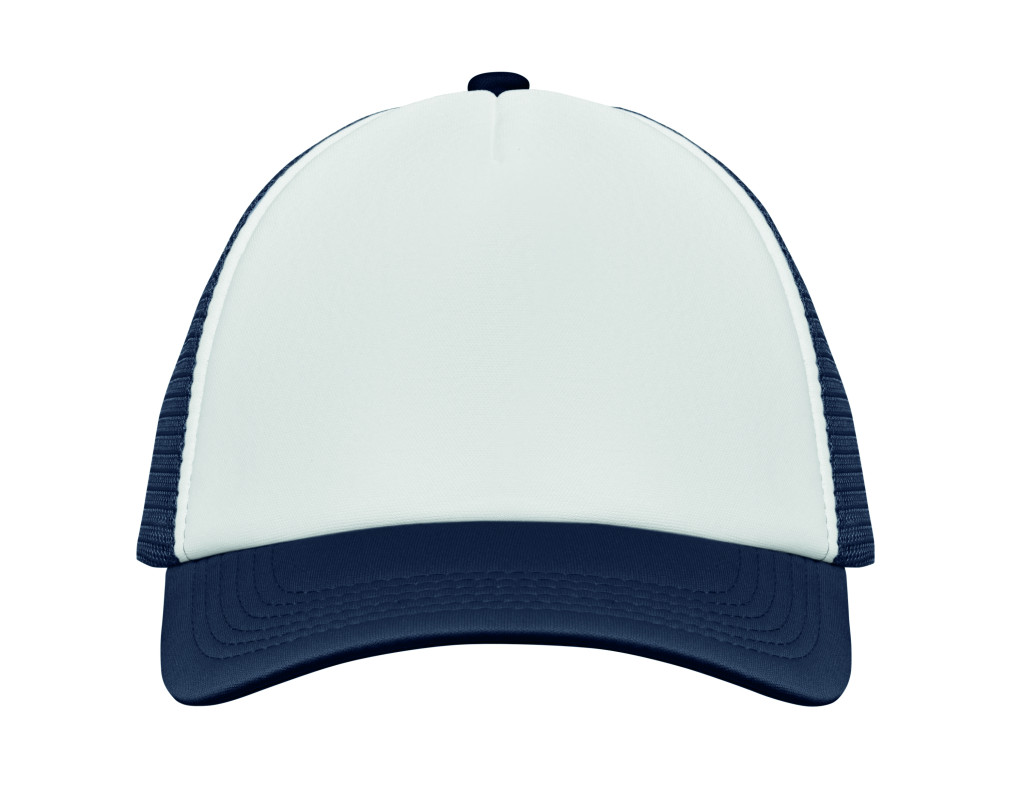 5 paneles poliészter 140-150 gr/m2 kamionos sapka. Állítható műanyag zárórész. Fehér elülső panel és színes napellenző jersey poliészter anyagból. A többi panel hálós anyagból. Méret: 7 1/4.