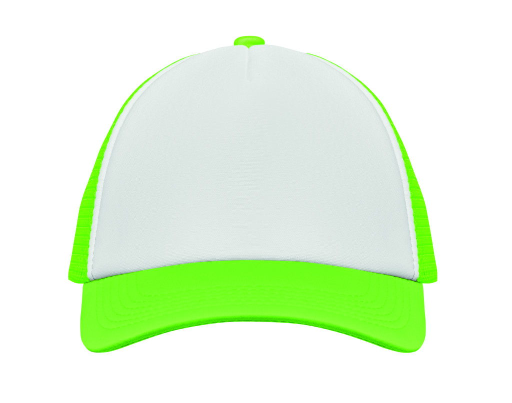 5 paneles poliészter 140-150 gr/m2 kamionos sapka. Állítható műanyag zárórész. Fehér elülső panel és színes napellenző jersey poliészter anyagból. A többi panel hálós anyagból. Méret: 7 1/4.