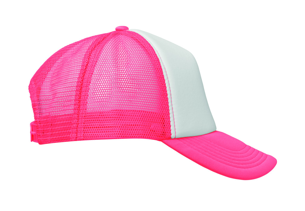 5 paneles poliészter 140-150 gr/m2 kamionos sapka. Állítható műanyag zárórész. Fehér elülső panel és színes napellenző jersey poliészter anyagból. A többi panel hálós anyagból. Méret: 7 1/4.