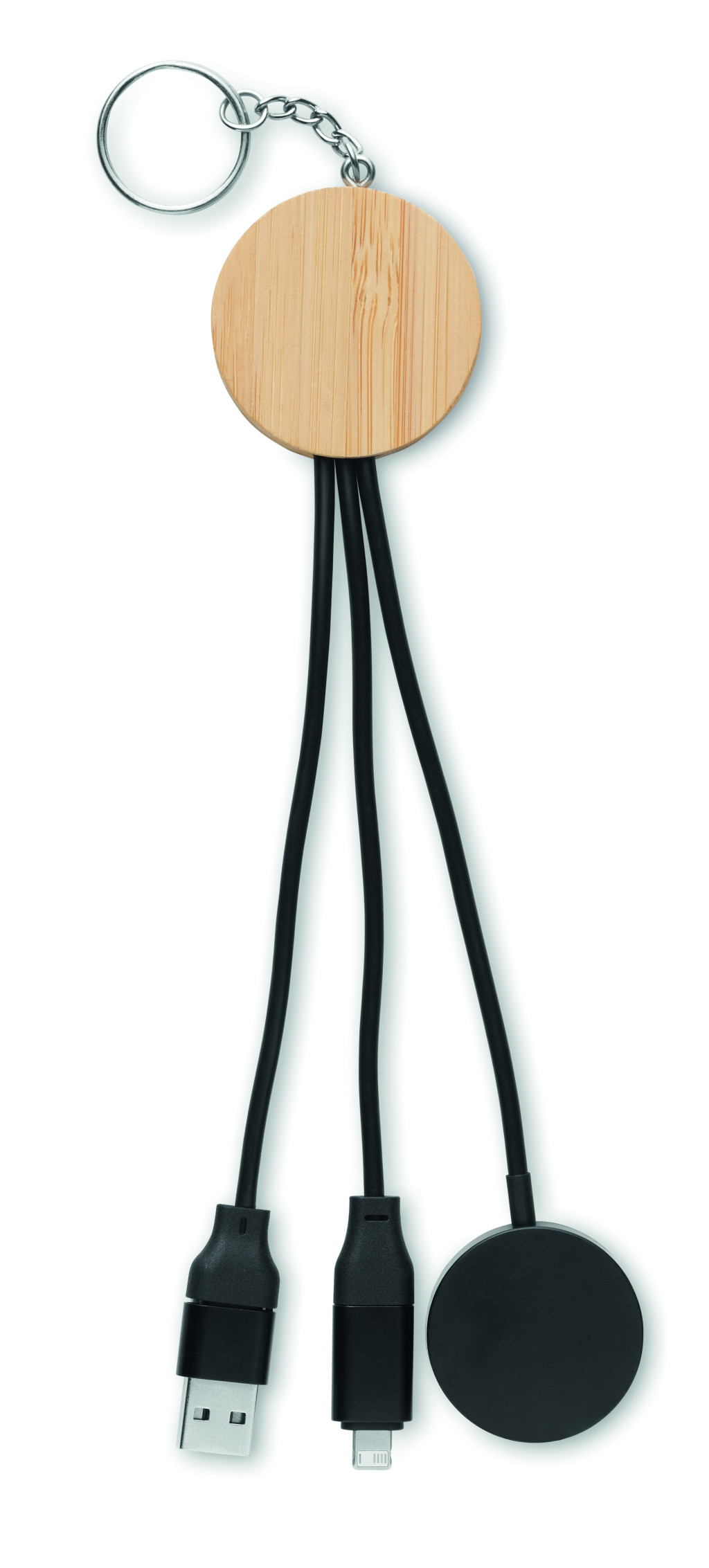 Kulcstartó 4 az 1-ben, 60W töltő- és adatátviteli kábellel, bambusz részletekkel. Bemenet: 2 az 1-ben C-típusú és USB-A. Kimenet: okosóra töltés (Samsung® és Apple®) , C-típusú és mikro-B (2 az 1-ben).