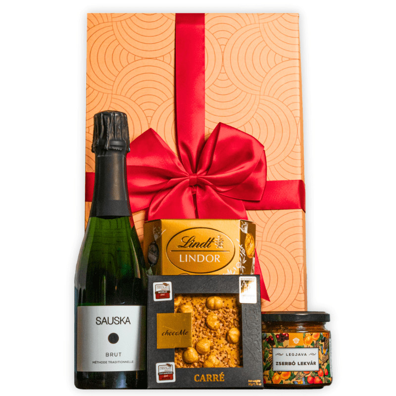 A "Bubbles & Dreams" csomag egy pezsgő ünnepi kényeztetés. A Sauska Brut pezsgő mellé a Lindt pralinék, a Chocome szőkecsokoládé és a kézműves zserbó lekvár garantálják a prémium ízélményt.