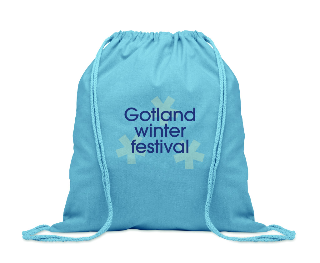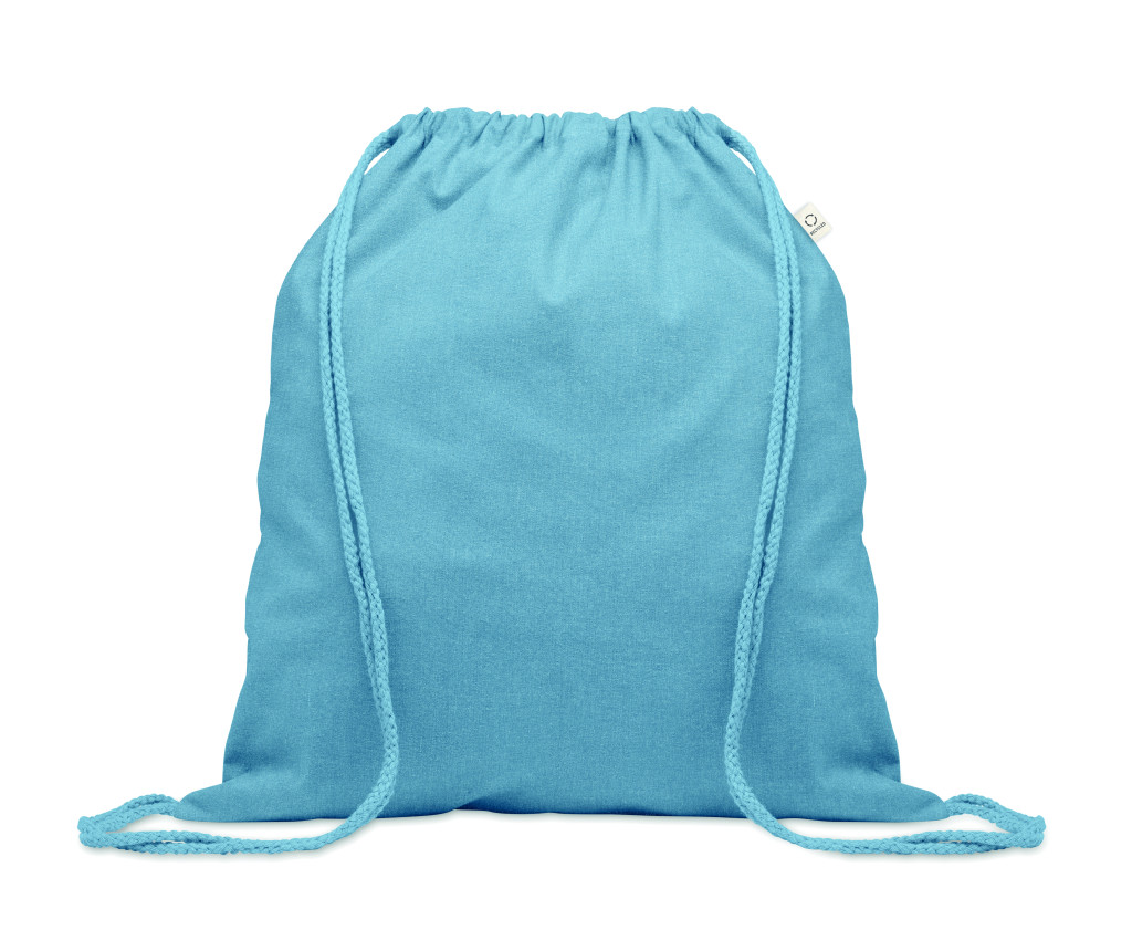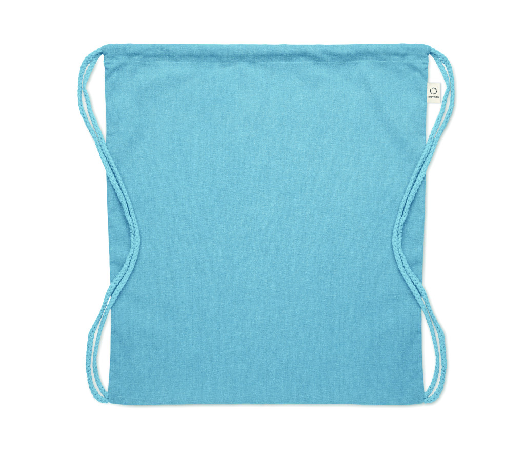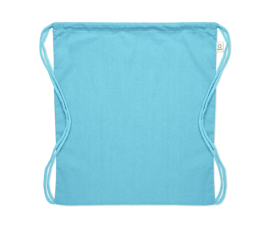 Húzózsinóros táska 30% fogyasztás előtti újrahasznosított pamutból és 30% RPET-ből. 140 g/m². Ez az anyag nyomtatás után zsugorodhat.