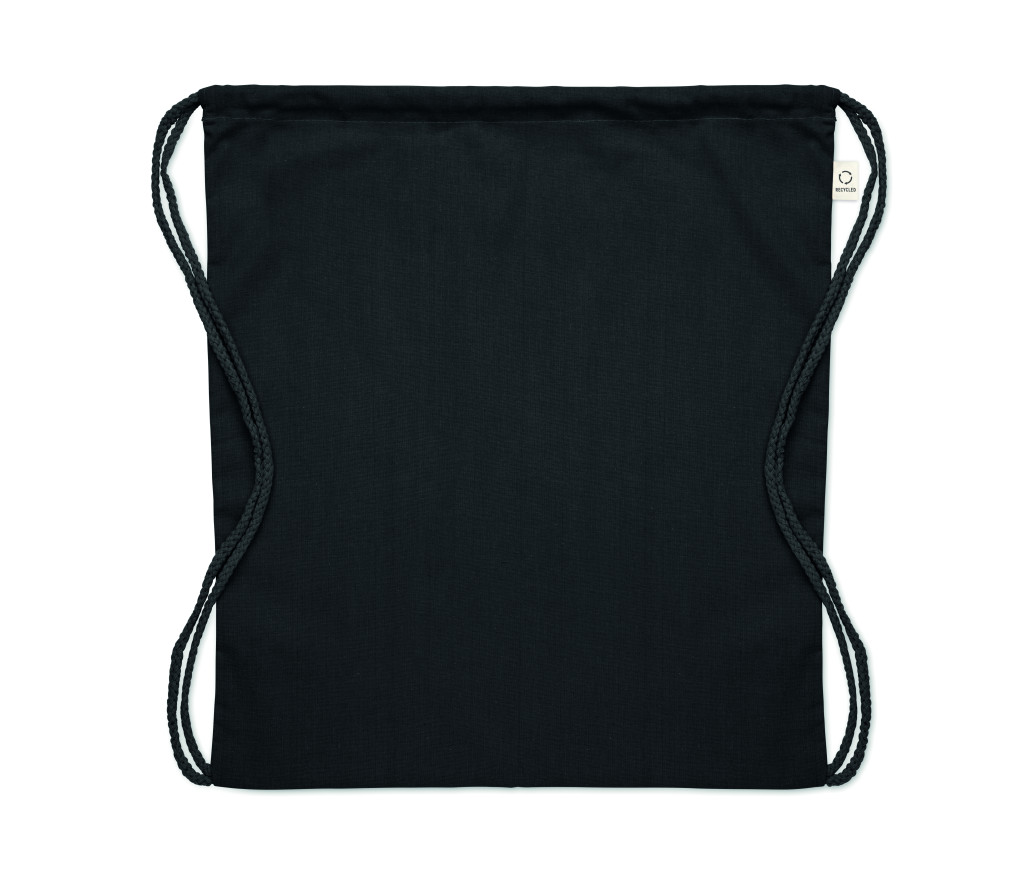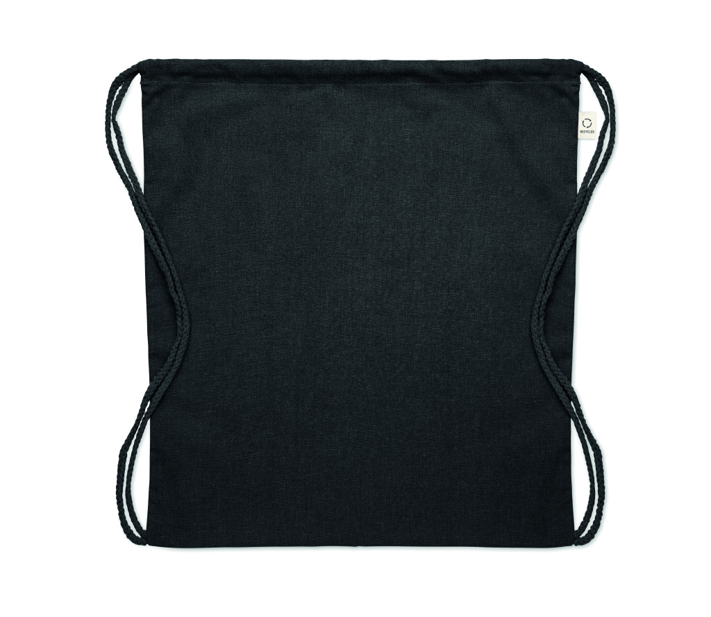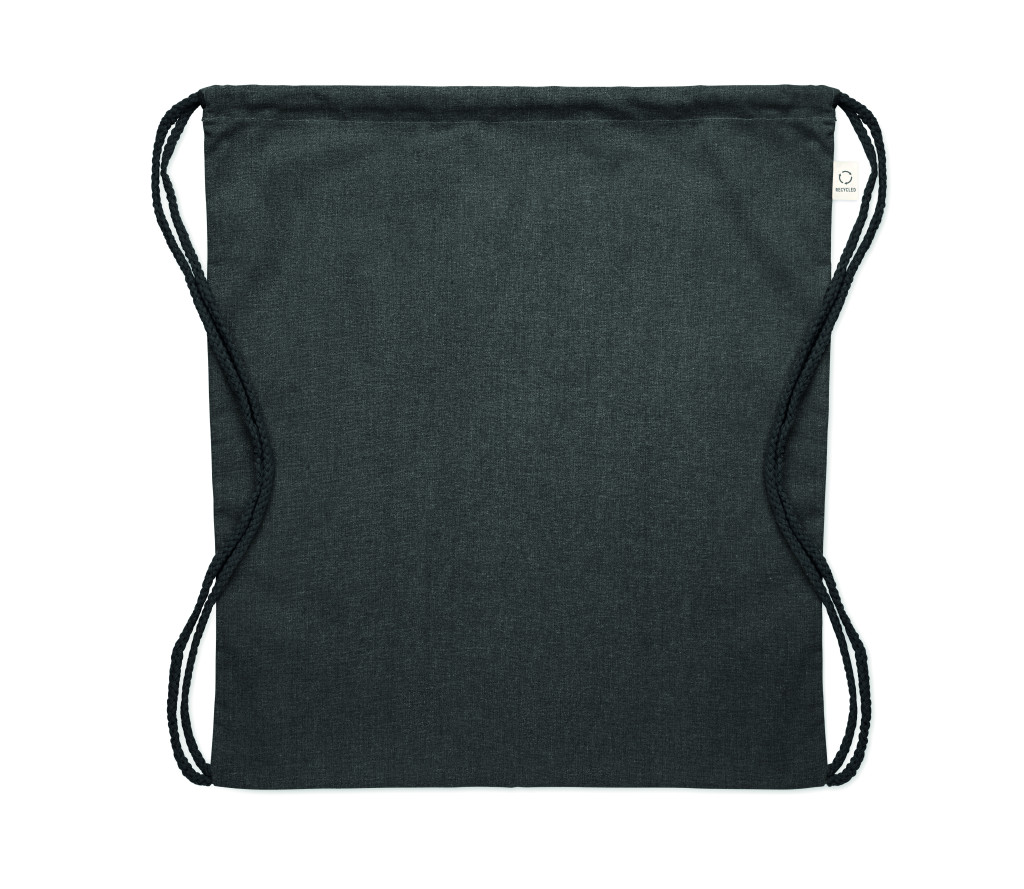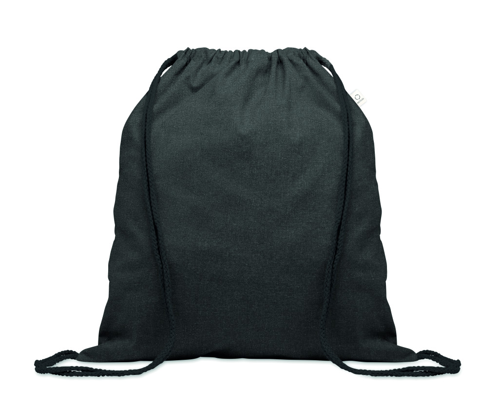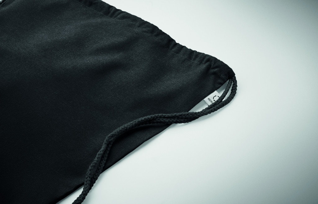 Húzózsinóros táska 30% fogyasztás előtti újrahasznosított pamutból és 30% RPET-ből. 140 g/m². Ez az anyag nyomtatás után zsugorodhat.